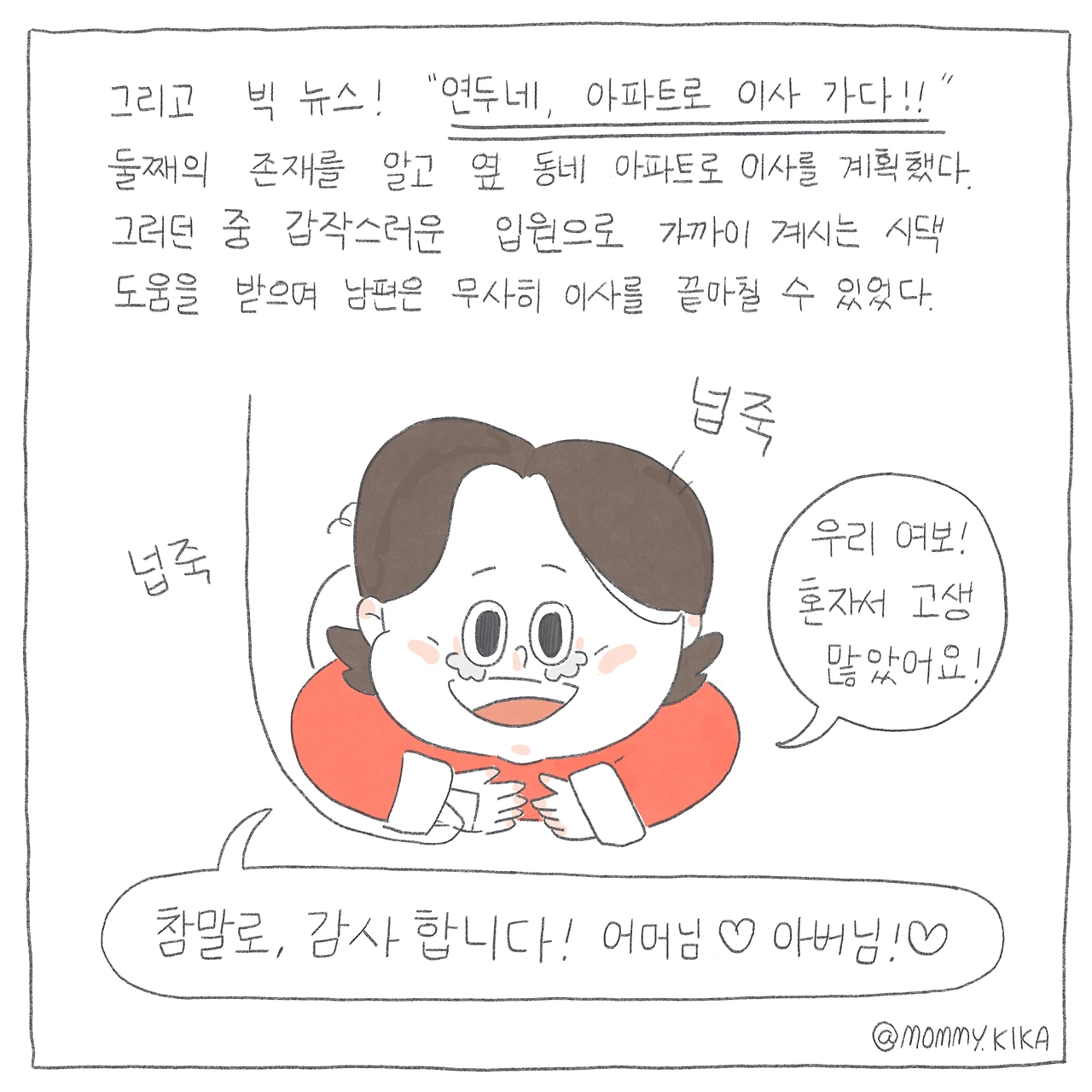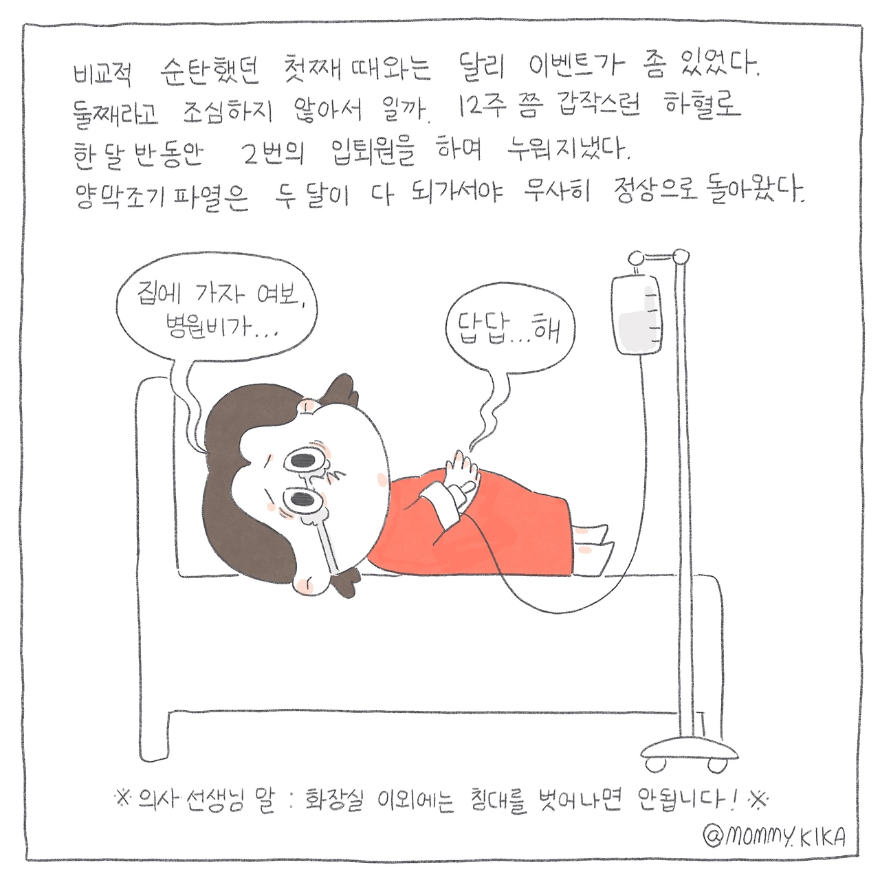 12주에 처음 입원을 하고 5일 있다가 퇴원을 했다. 그 후 14주에 두 번째 입원을 했고 일주일 입원 후 양수는 조금씩 새지만 무섭게 불어나는 입원비와 해줄 수 있는 건 그저 눕혀놓는 게 다라는 의사 선생님의 말에 집으로 향했다. 두 번째 입원을 한 사이에 집은 이사가 끝마쳤고, 작은 정리들을 엄마가 도와주었다. 그리고 일주일 후 다시 병원을 찾았을 때 우리가 그토록 기다리던 소식을 들었다. 양수가 더 이상 새지 않는다는 말!