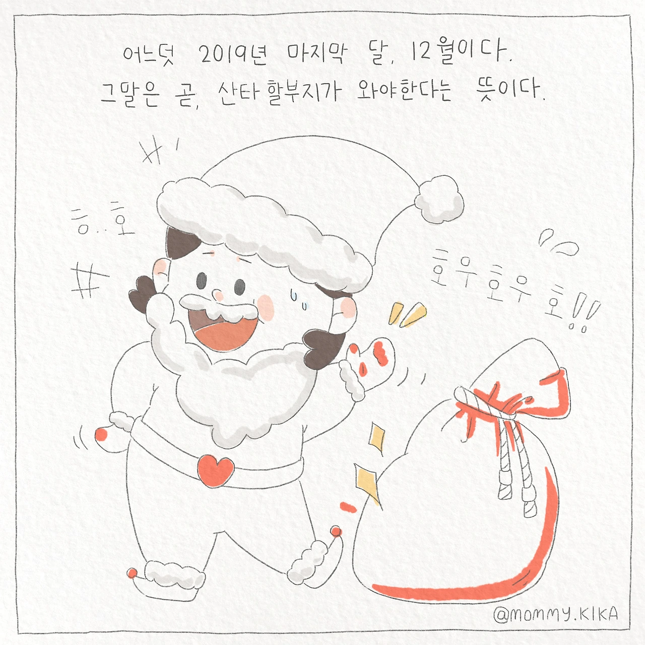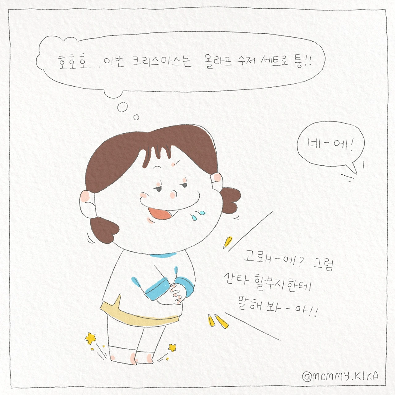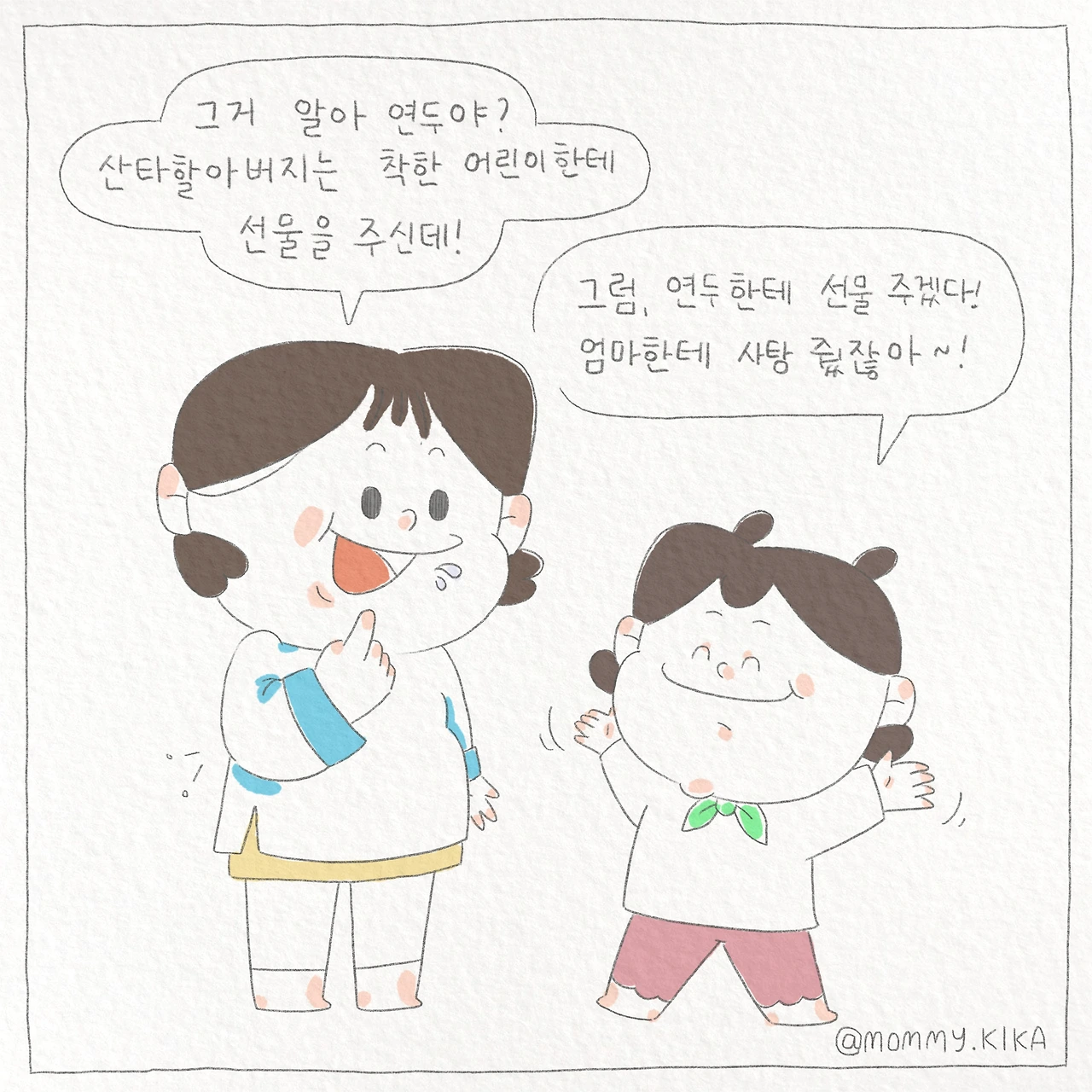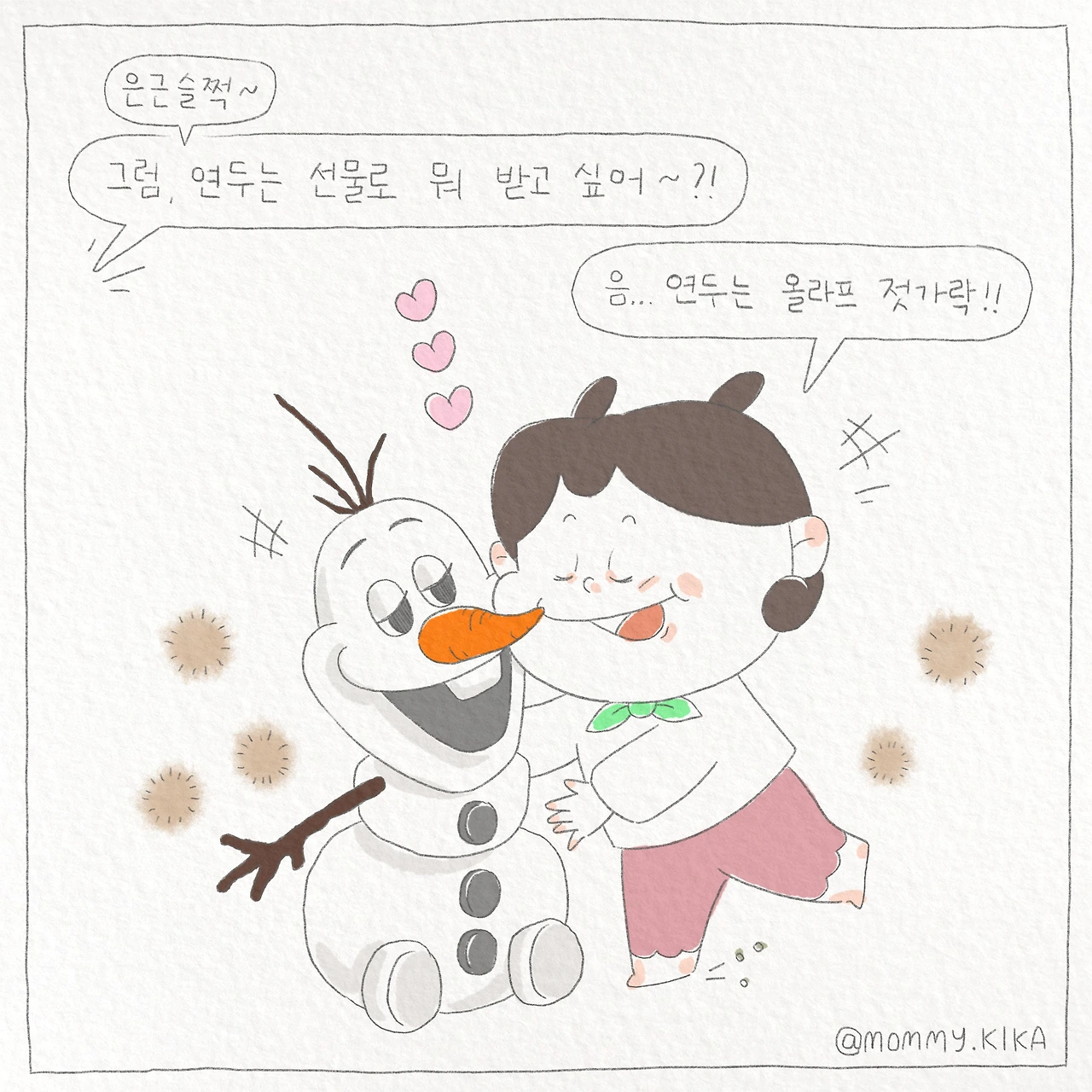 “착한 어린이는 산타 할아버지가 선물을 준대! 연두도 산타한테 올라프 젓가락 갖고 싶다고 말해봐! 그럼 혹시 선물로 받을지 누가 알겠어?”