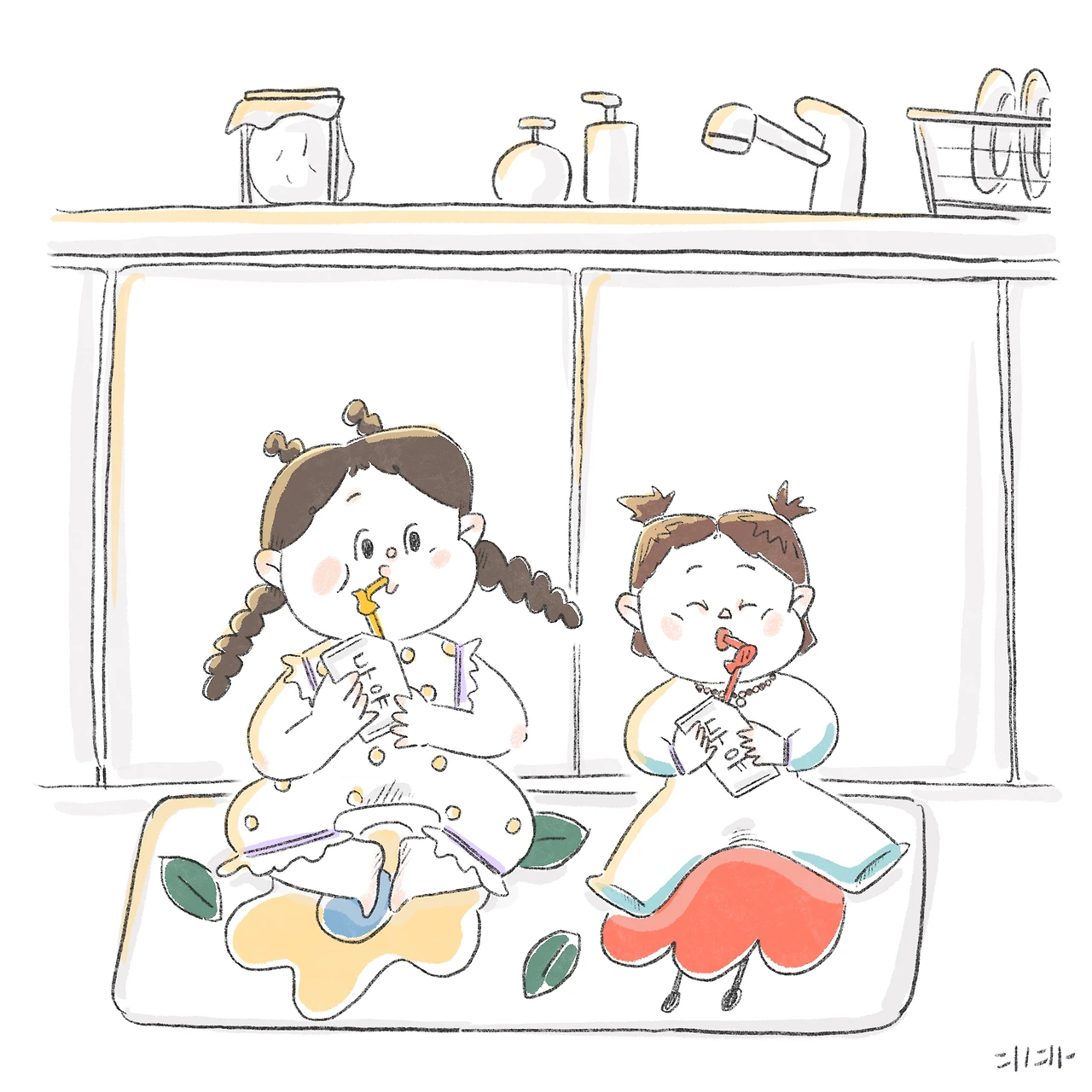 둘째는 역시나 금세 다 마셨고, 첫째는 따라 마시다 “엄마 그만 먹을래.” 하며 들어간다.