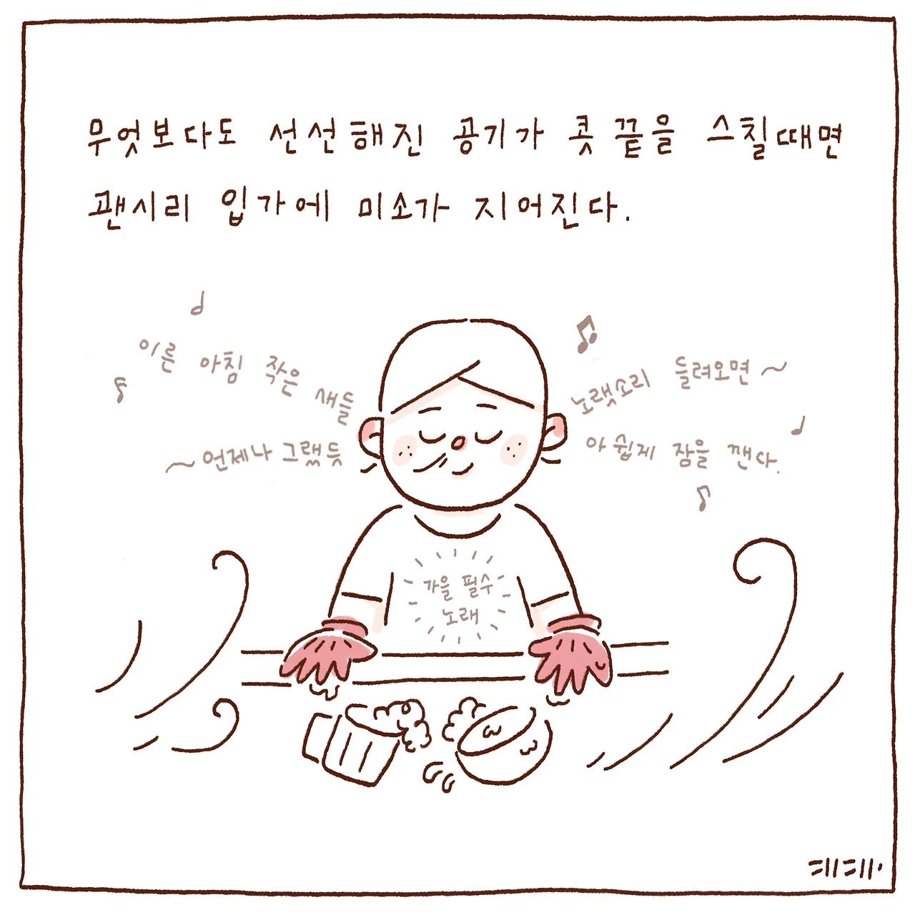올해의 가을은 설거지하다 창밖에서 불어오는 바람에 알아챘다. 코 속으로 들어오는 찬 바람이 어찌나 반갑던지. 아, 올해 겨울 즘이면 완전히 사라질 것이라고 생각했던 코로나는 지금도 여전히 우리 곁을 아주 많이 맴돌고 있고 나는 또 한 살을 먹게 되겠지? 정말 순식간에 시간들이 달려오는구나.