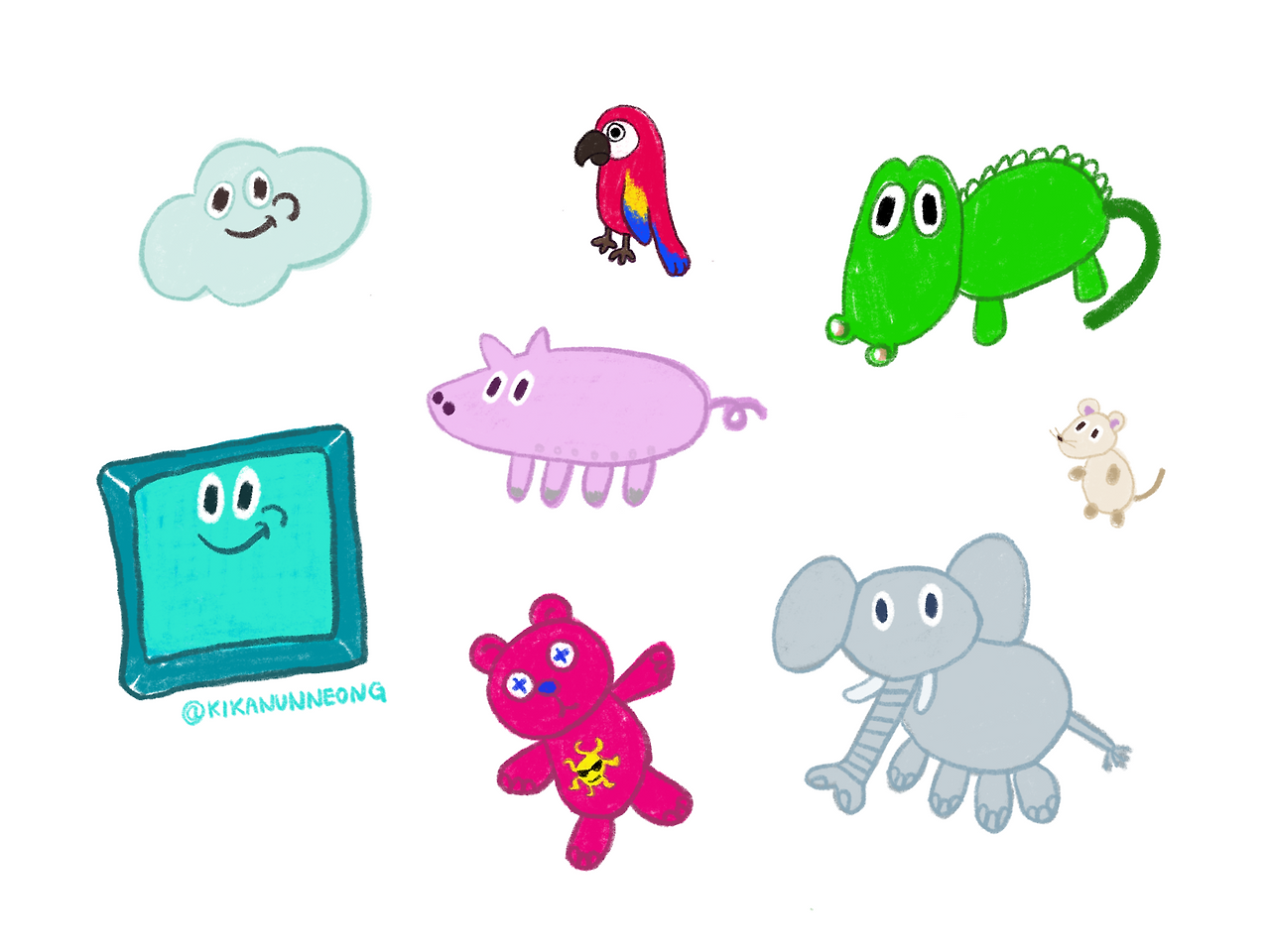 연두의 잠자리 친구들이다. 우리가 처음 선물한 인형은 lKEA에서 사온 꿀꿀이 인형이다.