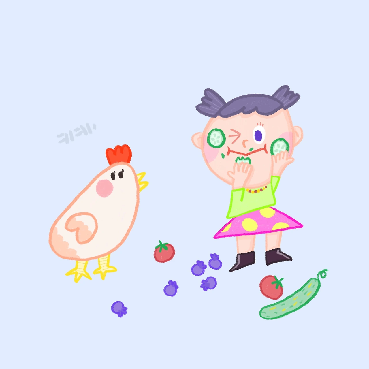 연두가 외할머니댁에서 지낸 지 한 달, 밭에서 블루베리도 따 먹고 방울토마토도 따 먹는 경험도 했다. 아침마다 꼬꼬댁! 하고 울던 닭을 꼬끼오-! 하며 따라 한다. 한 번씩 할머니와 오이 팩을 한다. 연두는 볼에 붙여준 오이를 쏙쏙 입으로 넣기 바쁘다. :)