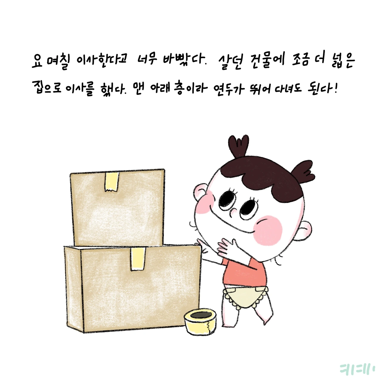최근 우리 가족에게 큰 변화가 생겼다. 하나는 미루고 미뤘던 차를 장만했다. 더는 시댁의 차를 빌리기에는 눈치도 보이고 어차피 있어야 하는 것! 질렀다. 또 하나는 마침 같은 건물에 조금 더 넓은 집이 비어 이사를 했다. 짐도 적고 바로 밑에 층이라 포장이사를 부르기에는 돈이 아까워 손수 이사를 했다. 덕분에 우리의 몸은 몇 일간 남아나지 않았지만, 연두가 거실에서 바닥에 누워 이리 뒹굴 저리 뒹굴 듯하며 행복해하는 모습을 보니 그 순간만큼은 피곤이 싹 가셨다.