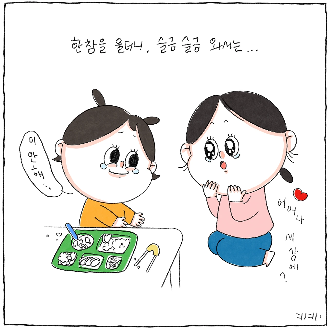 이게 학습이 되었는지 한참을 울다 진정이 조금 됐는지 나에게 다가와 눈을 맞추며 “미안해.”를 했다. 얼마나 놀라운 일인가. 자발적인 “미안해.” 였다. 신기하고도 기특한 연두.
