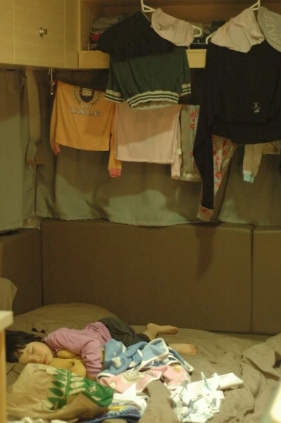 실내건조함 때문에 침대위에 줄을 치고 젖은 빨래들을 널어 놨다.