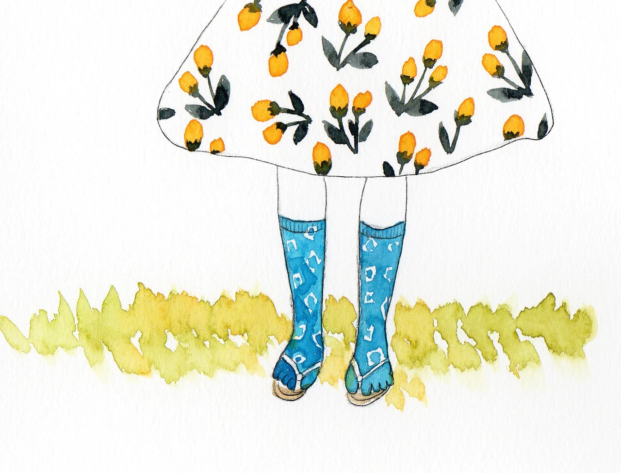 꽃 치마에, 샌들에, 발가락 양말을 신은 그녀.