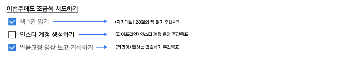 예를 들어 올해 커리어 목표 중 하나는 말하는 톤과 발음을 교정하는 것이다. 이 목표를 달성하기 위해서는 발음과 톤 교정하기, 구조적으로 말하는 연습하기, 실전 연습하고 피드백받기와 같이 세부 계획들이 필요하다.