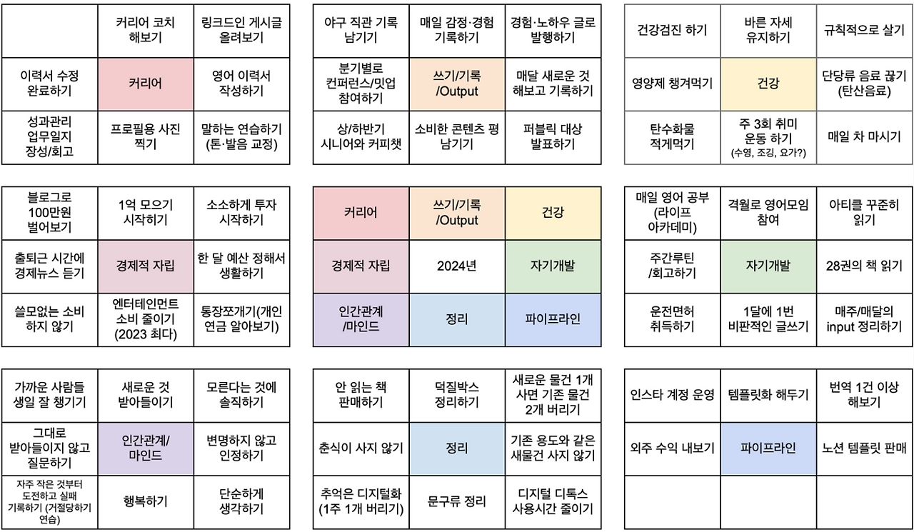2024년 만다라트는 커리어, 기록, 건강, 자기개발, 파이프라인, 정리, 마인드, 경제적 자립으로 나누어서 작성했다. 그 이후에는 올해 각 카테고리에서 이뤄내고 싶은 목표를 쭉 적었다. 적기 어렵다면 사소한 것도 좋다.