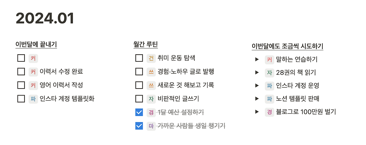 일 년 동안 챙겨야 하는 목표는 ‘한 달에 한번 ~하기’에 가깝다. 단기에 끝나지도, 세부적인 계획이 필요하지도, 매일 해야 하지는 않지만 월간 계획과 주간 계획을 세울 때 확인하고 적당히 끼워 넣어야 되는 목표다.