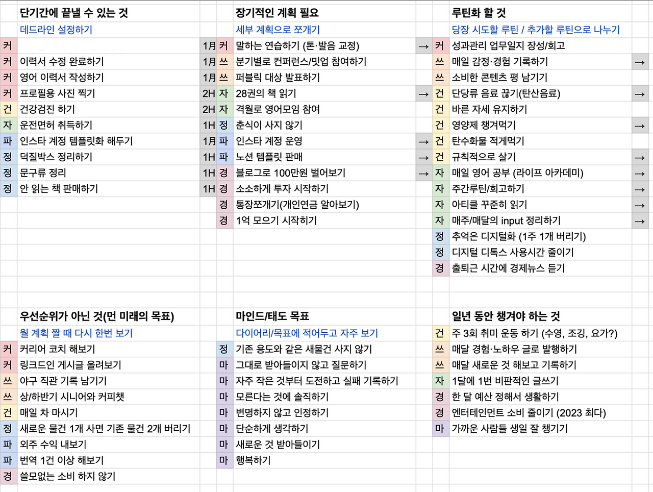 64개의 실천과제를 다시 나눈다. 먼저 만다라트에 적긴 했지만 생각해 보니 우선순위가 아닌 것들을 골라낸다. 그리고 실행 기간에 따라 단기간에 끝낼 수 있는 것, 장기적인 계획이 필요한 것. 루틴화 할 것, 일 년 동안 챙겨야 하는 것(연간루틴, 월별루틴)으로 나눈다.