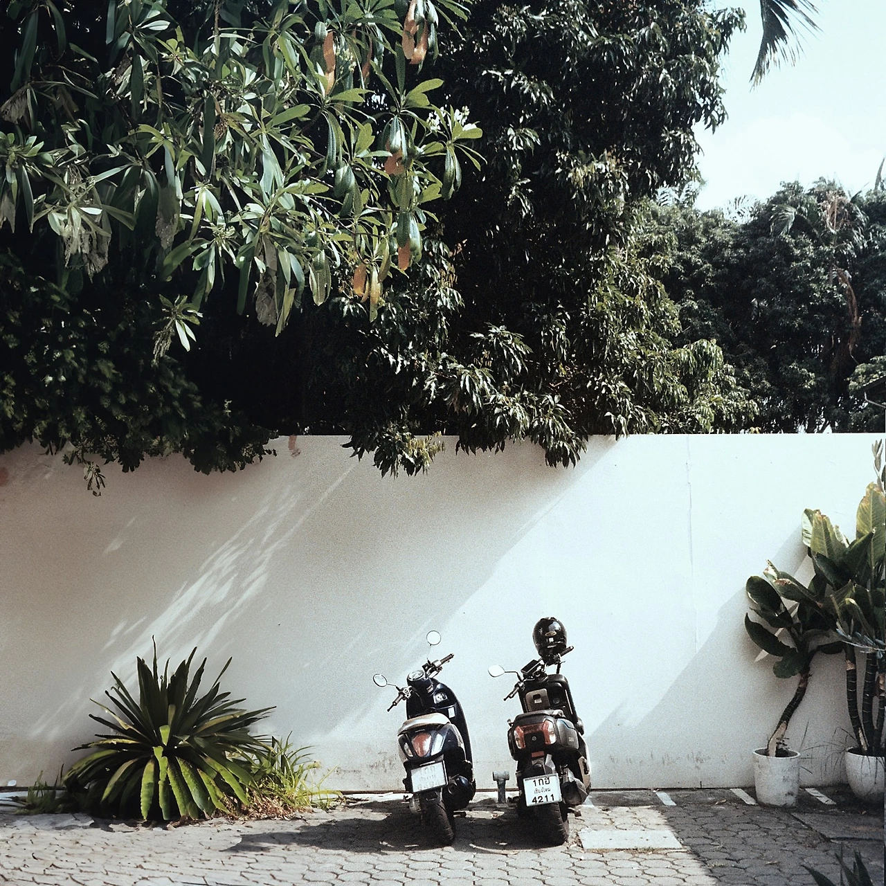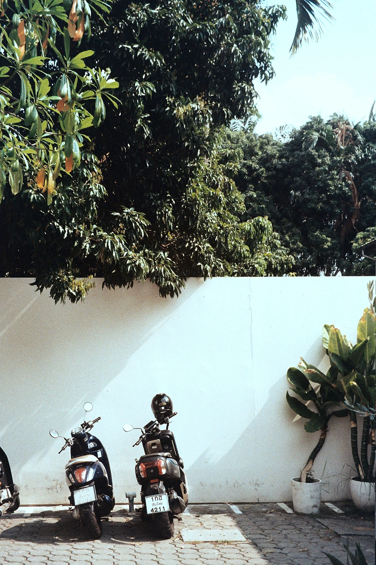 오토바이 왼쪽의 식물은 'plant'라고 프롬프트
