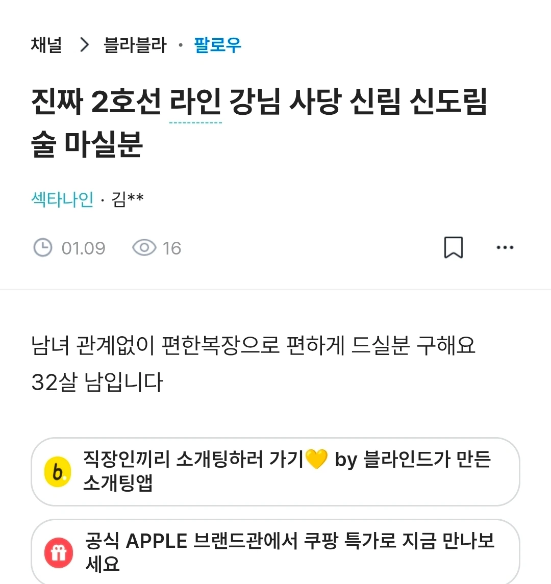 "사당 오늘 저녁에 간단하게 술 한잔 하실 분?"