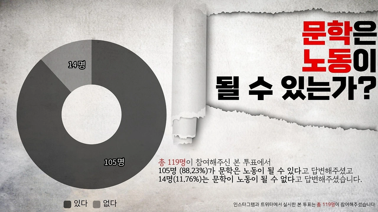 트위터와 인스타그램에서 진행한 본 투표에는 총 119명이 참여해주셨다. 그중 105명인 88.23%가 문학은 노동이 될 수 있다고 답변해 주셨고, 14명인 11.76%가 문학은 노동이 될 수 없다고 대답해 주셨다.