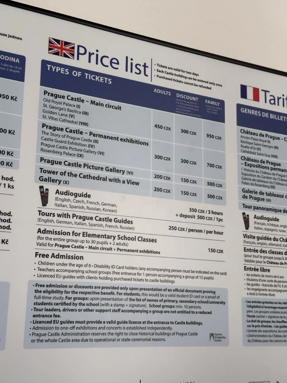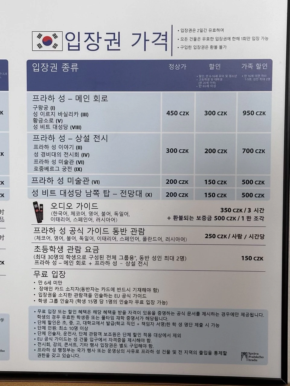프라하 성은 규모가 꽤 컸다. 입장권을 사러 갔는데 줄이 길어 우선 J가 줄을 서고 P가 입장권 가격표를 사진으로 찍어오기로 했다. 입장권 종류가 다양했는데 어느 걸 사야 하나 고민에 빠졌다. 친절하게 한국어 안내도 있었지만 - 번역서를 본 사람이 한 번쯤 해봤을 경험, 한국어인데 뭔 말인지 모르겠는 그런 상황에 빠졌다.