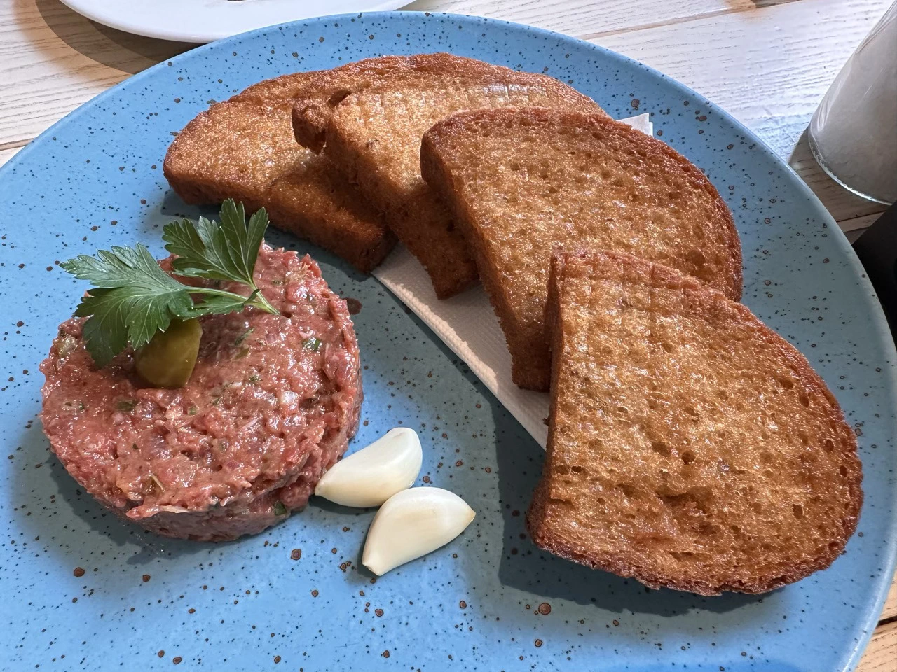 이미 배부르게 먹었지만 타르타르에 미련이 남은 J는 맥주를 한 잔 추가로 주문하면서 혹시 타르타르를 먹을 수 있냐고 물었다. 다행히 가능하다고 했고 기다림 끝에 만난 타르타르는 너무도 맛있었다. 한국인이 해외에 오래 있다 보면 마늘 생각이 안 날 수가 없는데 무려 생마늘을 준다. 이것을 빵에 갈아서 마늘빵을 만들고 육회를 곁들여 먹는 것인데 체코에서 먹은 것 중, 아니 이 여행에서 먹은 것 중 가장 맛있었다!