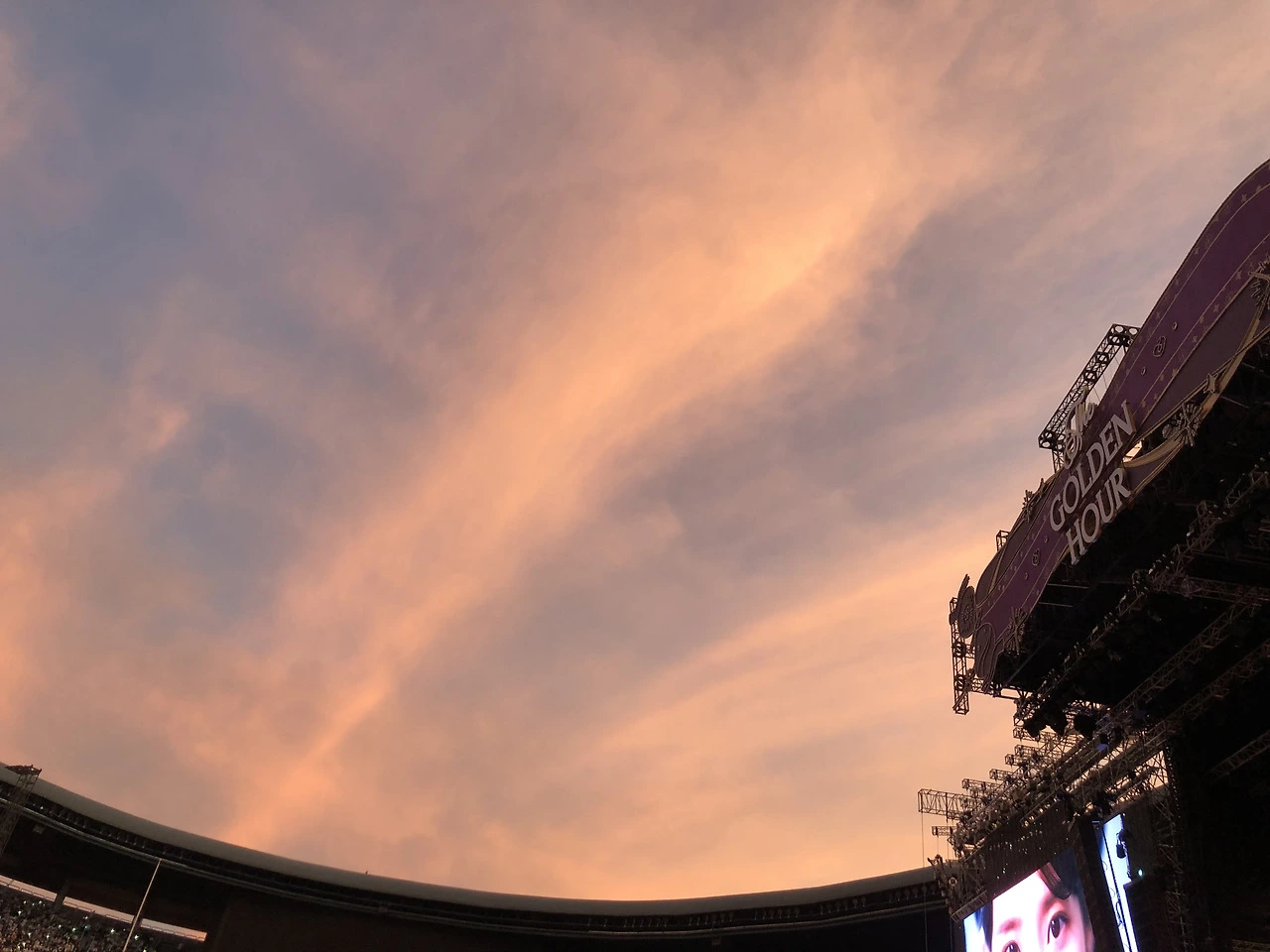 공연장은 하늘이 훤히 보이는 서울 잠실 종합운동장이었다. 해를 가릴 정도는 아니었지만 드문드문 구름이 있었다. 두껍지 않아 하얀 구름. 이윽고 공연 시간이 다가오자 구름에 노을이 반사되어 점차 주황빛을 띠었고 시간이 지날수록 붉은 기는 더 강해졌다.