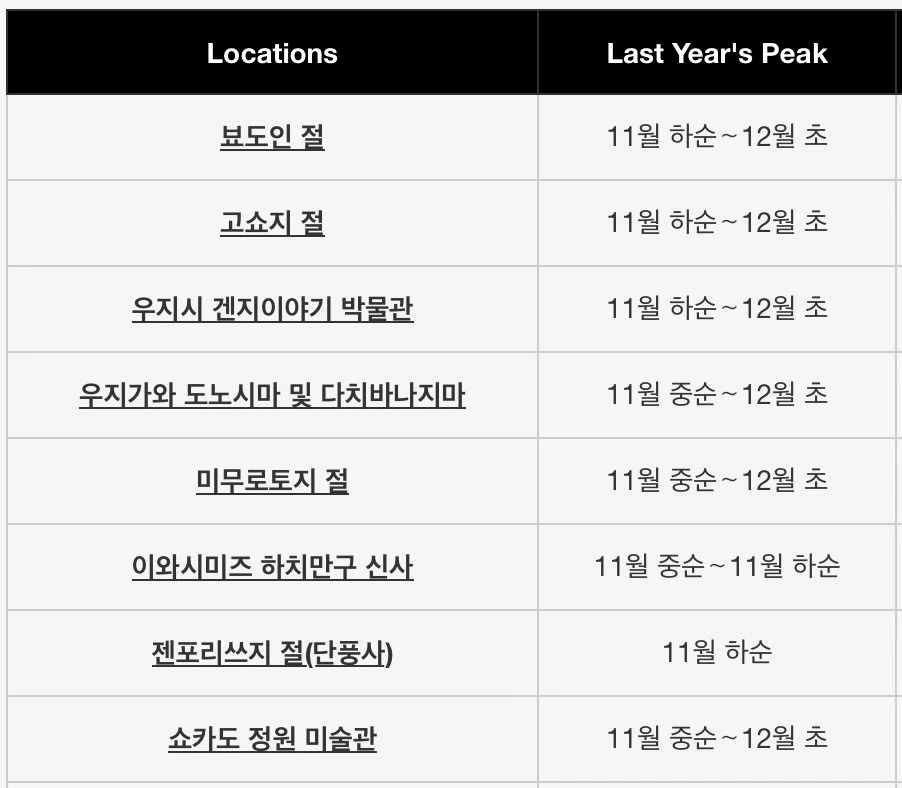 위 내용은 교토 여행 공식 홈페이지에서 2024년 단풍을 예보했던 내용이며 실제 방문했던 사람들의 후기를 찾아보면 12월 초에 단풍이 절정이었다는 내용을 쉽게 접할 수 있다.