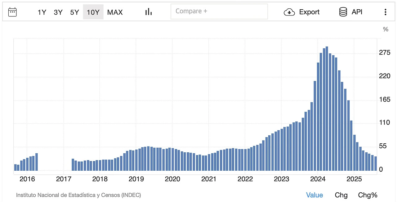 아래는 아르헨티나 인플레이션 그래프이다. (출처: Trading Economics)
