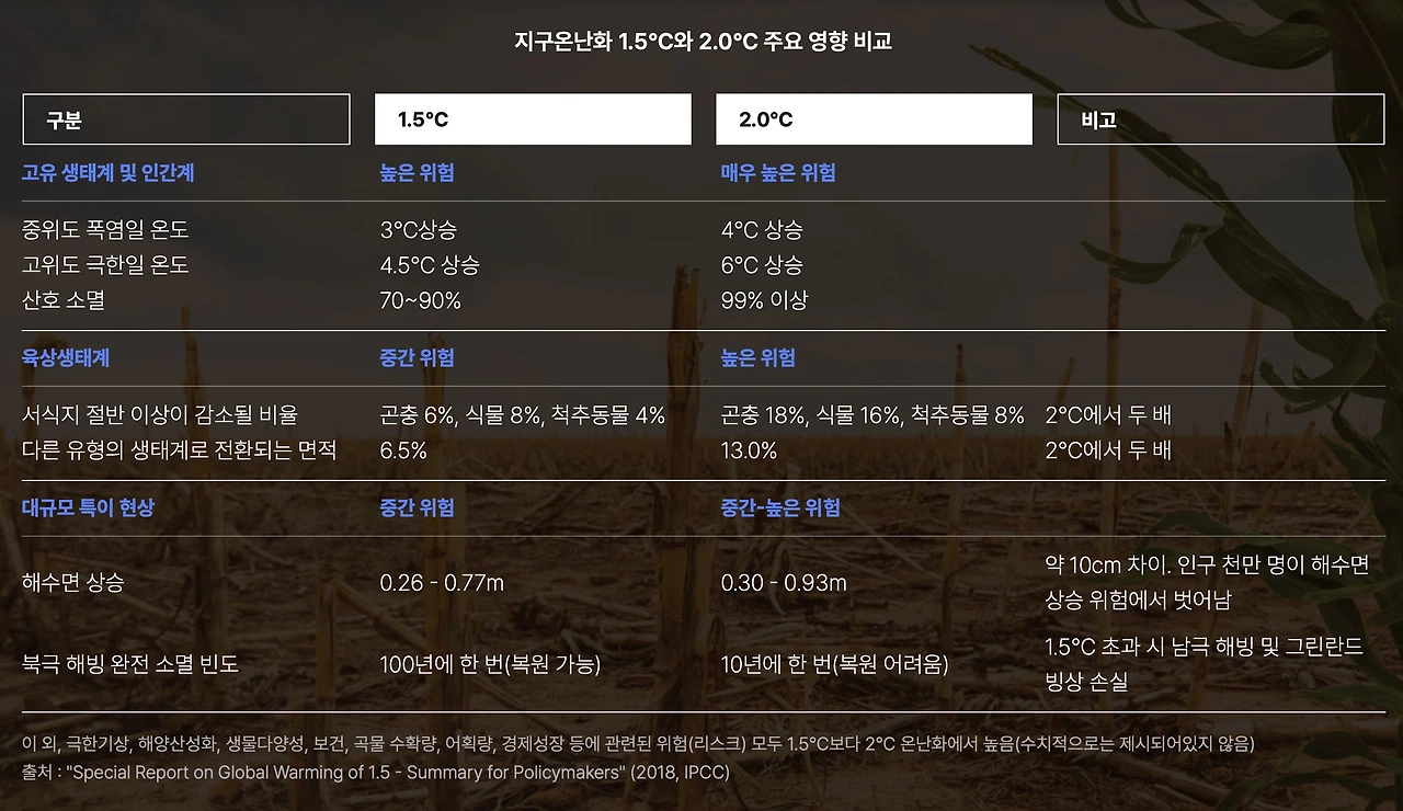 아래 내용은 1.5°C 높아질 경우와 2.0°C 높아질 경우 예상되는 주요 영향에 대한 것으로, 1.5°C만 높아져도 생태계에 위험을 끼치는 것을 알 수 있다.
