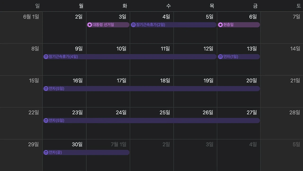 앗, 그러고 보니! 2025년 6월에 생긴 임시 공휴일이 있었다. 6월 3일 대통령 선거일. 엑셀 파일로 시뮬레이션할 당시는 대통령 선거일이 정해지지 않아 이 부분이 누락됐었다. 그럼 6월 2일(월요일)이 마지막 출근일이고 3일부터 휴가 상태나 다름없다. 이 사실을 깨닫고 나는 소위 말하는 '될놈될'(될 놈은 된다)인가 생각을 했다.