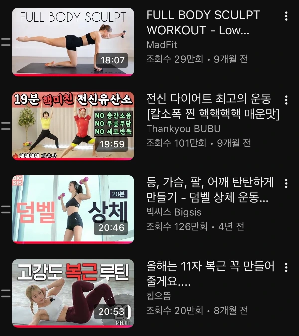 회사 다닐 때는 점심시간에 운동을 했다. 예전에 짧게 PT를 받은 적이 있고 필라테스도 꽤 오래 다닌 경험이 있어 매트에서 하는 맨몸운동을 선호한다. 하지만 가끔 땀 빼고 싶은 날은 회사 근처 공원을 빨리 걷기로 돌고 오기도 했다. 지금은 팬데믹 때처럼 집에서 매트를 깔고 유튜브를 통해 운동 영상을 따라한다. 컨디션에 따라 차이는 있지만 대체로 20분 전후의 영상을 두 편(서로 다른 부위의 근력 운동 2편 혹은 근력 1편+유산소 1편 조합) 보기에 총 운동 시간은 35~45분 정도 된다.