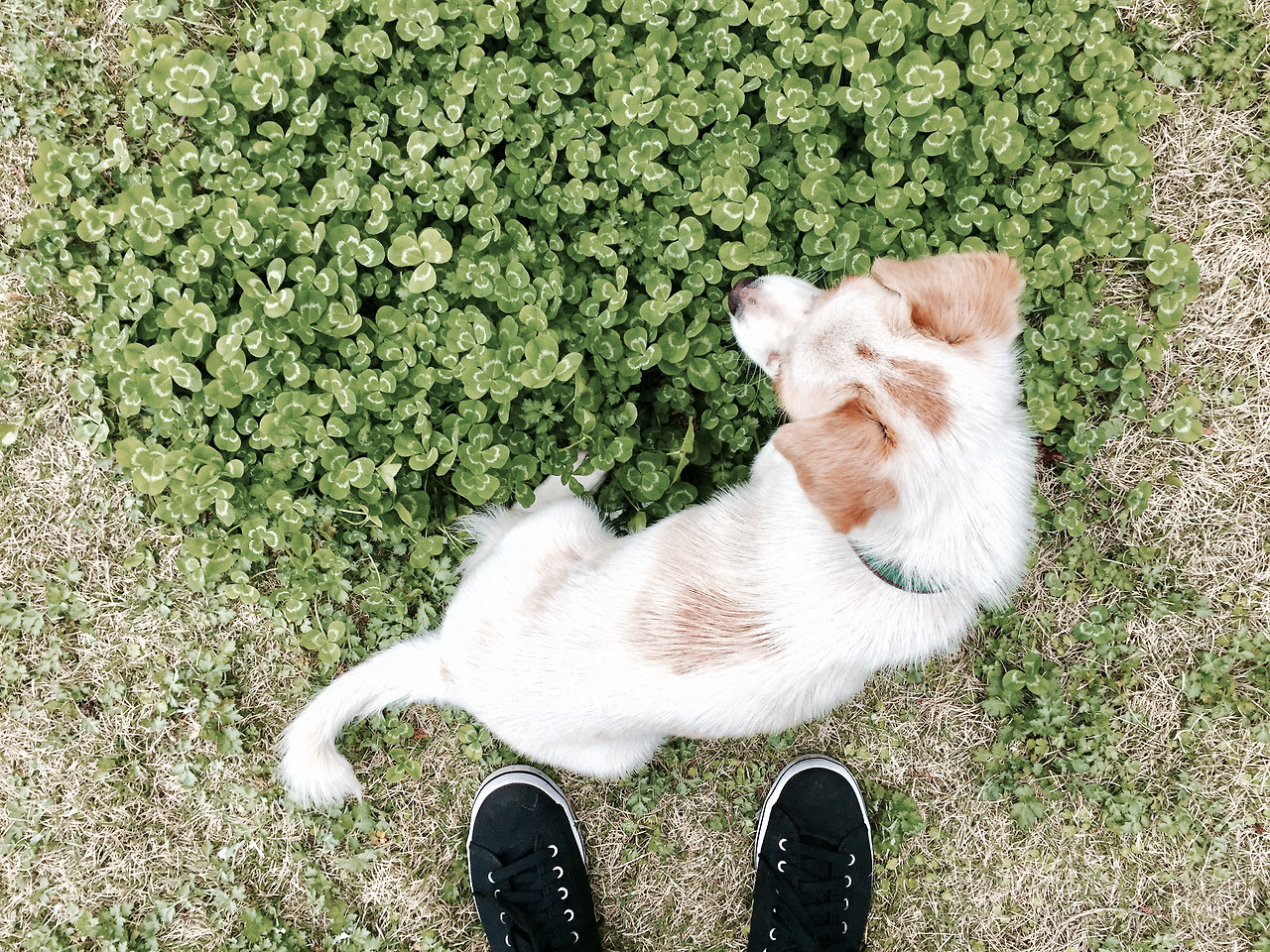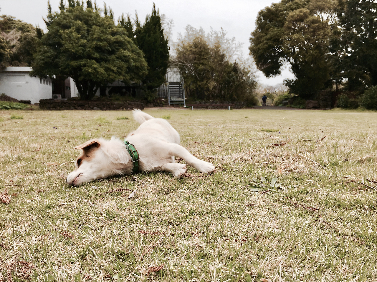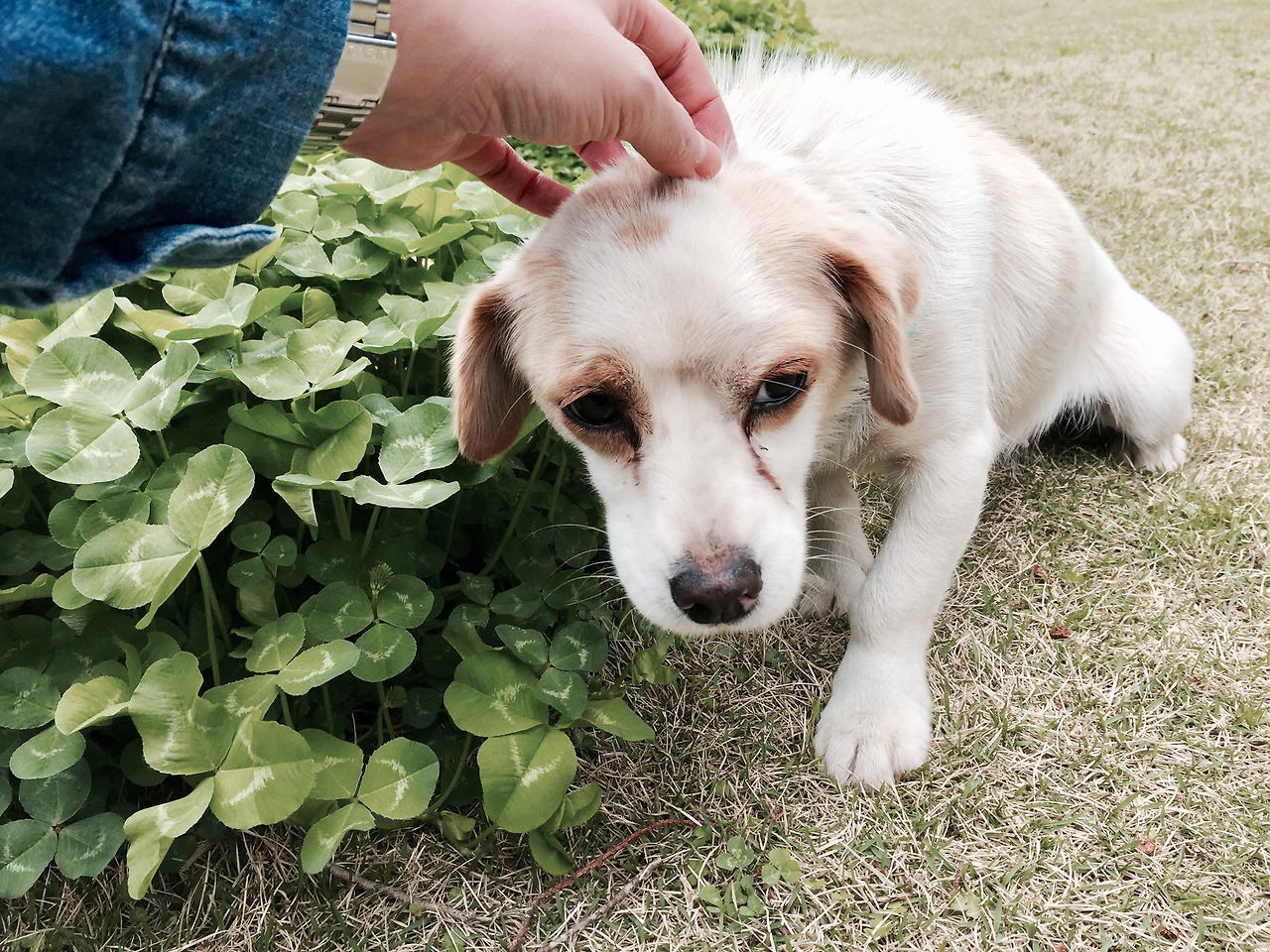 클로버 찾기에 몰두하는 중 개 한 마리가 후다닥 품에 들어와 비벼댔다. 갑자기 나타난 친구가 반가워 만져주고 놀아주고 같이 뛰었다. 한참 만지다가 쉬니까 더 만져달라고 앞 발로 내 손을 끌어당겼다. 그 동네 사는 아롱이라는 녀석인데 그렇게 종종 두모악에 찾아와 놀다 간단다. 두모악 손님들이 내 개라고 생각하는 것 같았다.