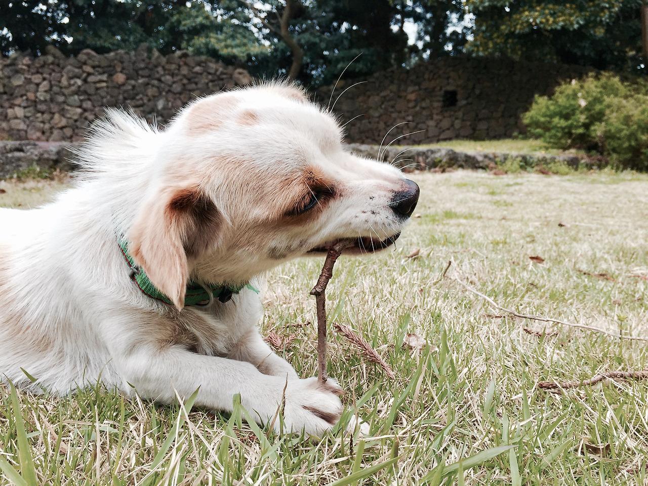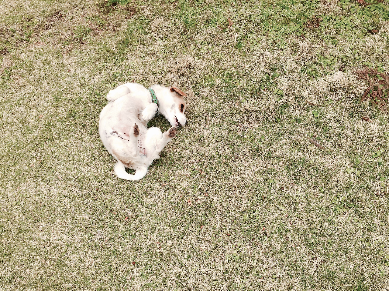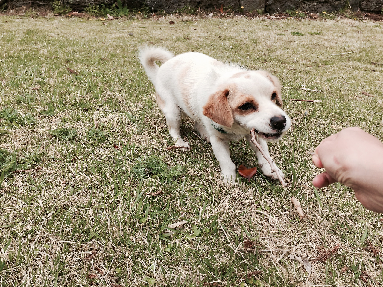 클로버 찾기에 몰두하는 중 개 한 마리가 후다닥 품에 들어와 비벼댔다. 갑자기 나타난 친구가 반가워 만져주고 놀아주고 같이 뛰었다. 한참 만지다가 쉬니까 더 만져달라고 앞 발로 내 손을 끌어당겼다. 그 동네 사는 아롱이라는 녀석인데 그렇게 종종 두모악에 찾아와 놀다 간단다. 두모악 손님들이 내 개라고 생각하는 것 같았다.