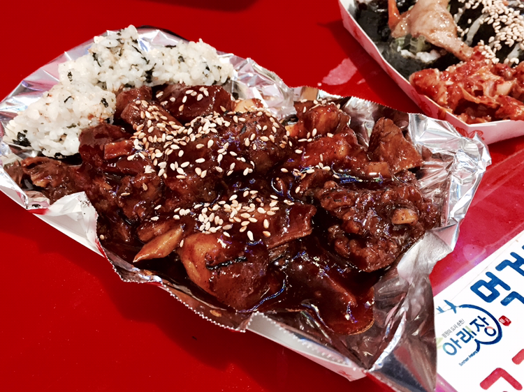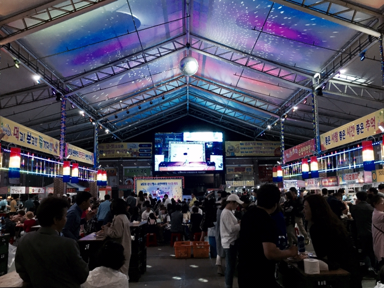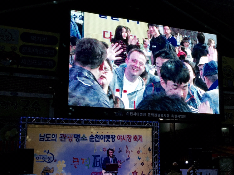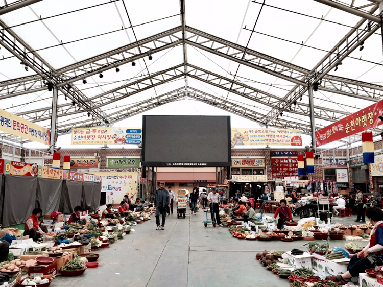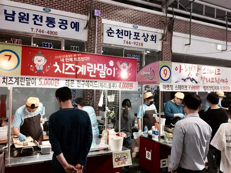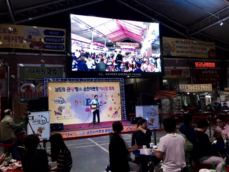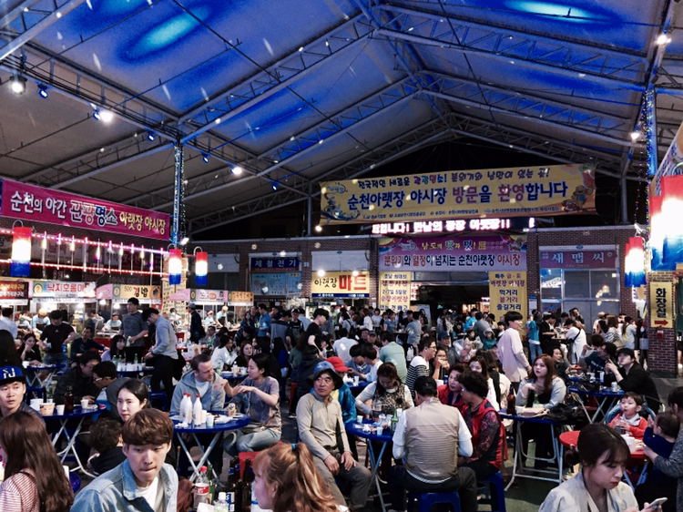 순천 아랫장은 금요일, 토요일마다 먹거리 야시장으로 변한다. 사이키 조명과 미러볼이 등장하고 흥겨운 무대도 펼쳐진다. 낮에 할매할배들이 채소 과일 팔던 시장이 밤엔 축제 분위기로,