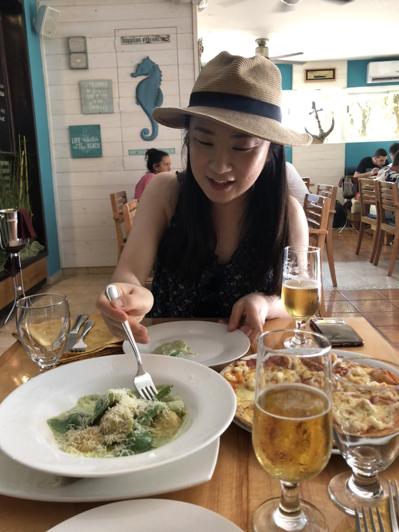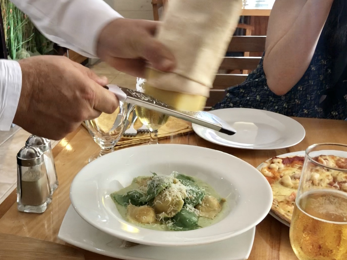 씨푸드 메뉴가 훌륭할 필링에 여기서야말로 랑고스타 요리의 끝판을 맛볼 수 있을 것 같지만, 눈물을 머금고 비교적 저렴하고 배부를 것 같은 '씨푸드 피자'로 타협. 옆자리 꼬꼬마가 먹는 두툼한 스테이크도 와구와구 먹고 싶지만, 비교적 저렴하고 배부를 것 같은 '라비올라'와 곁들임 맥주에 만족하기로 한다. 싸구려 병맥주를 막 아이스 버킷에 넣어다 주고, 애피타이저도 주고, 라비올라 위에 치즈도 직접 갈아줘서 하트가 뿅뿅했는데 요리까지 훌륭하다, 훌륭해.