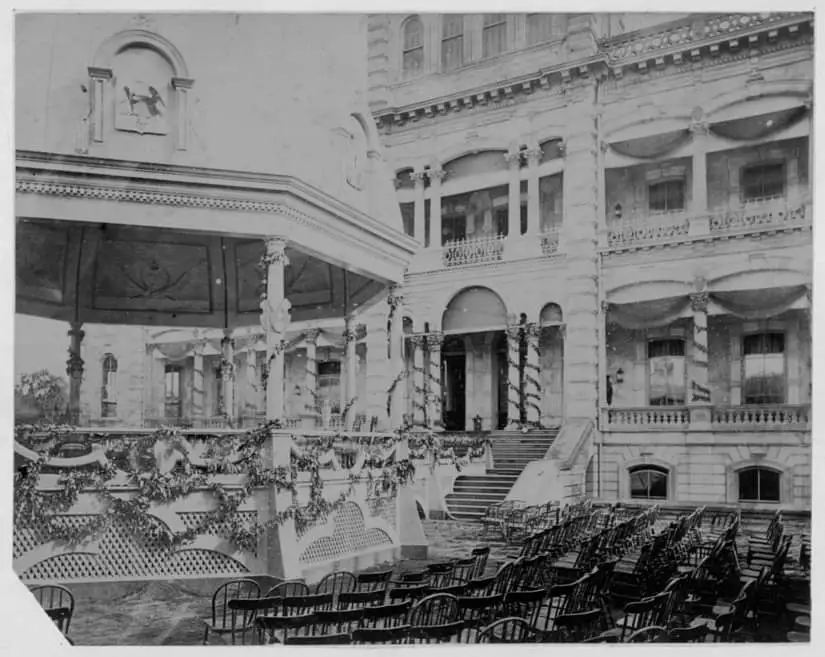 궁전의 현관 계단 앞에 테이블이 펼쳐졌고, 흰 제복을 입은 칼라카우아 Kalakaua 왕은 그의 관료들과 정부 관계자 사이에 자리했다.