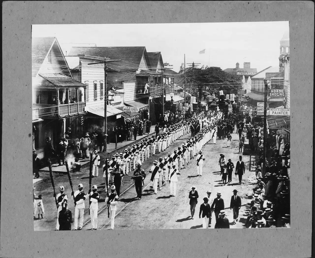 칼라카우아 Kalakaua 선왕의 관이 이올라니 궁전 Iolani Palace 을 떠날 때, 펀치볼 Punchbowl 정상과, 미군의 두 함대 Charleston 과 Mohican 에서 분전포가 발사되었다.