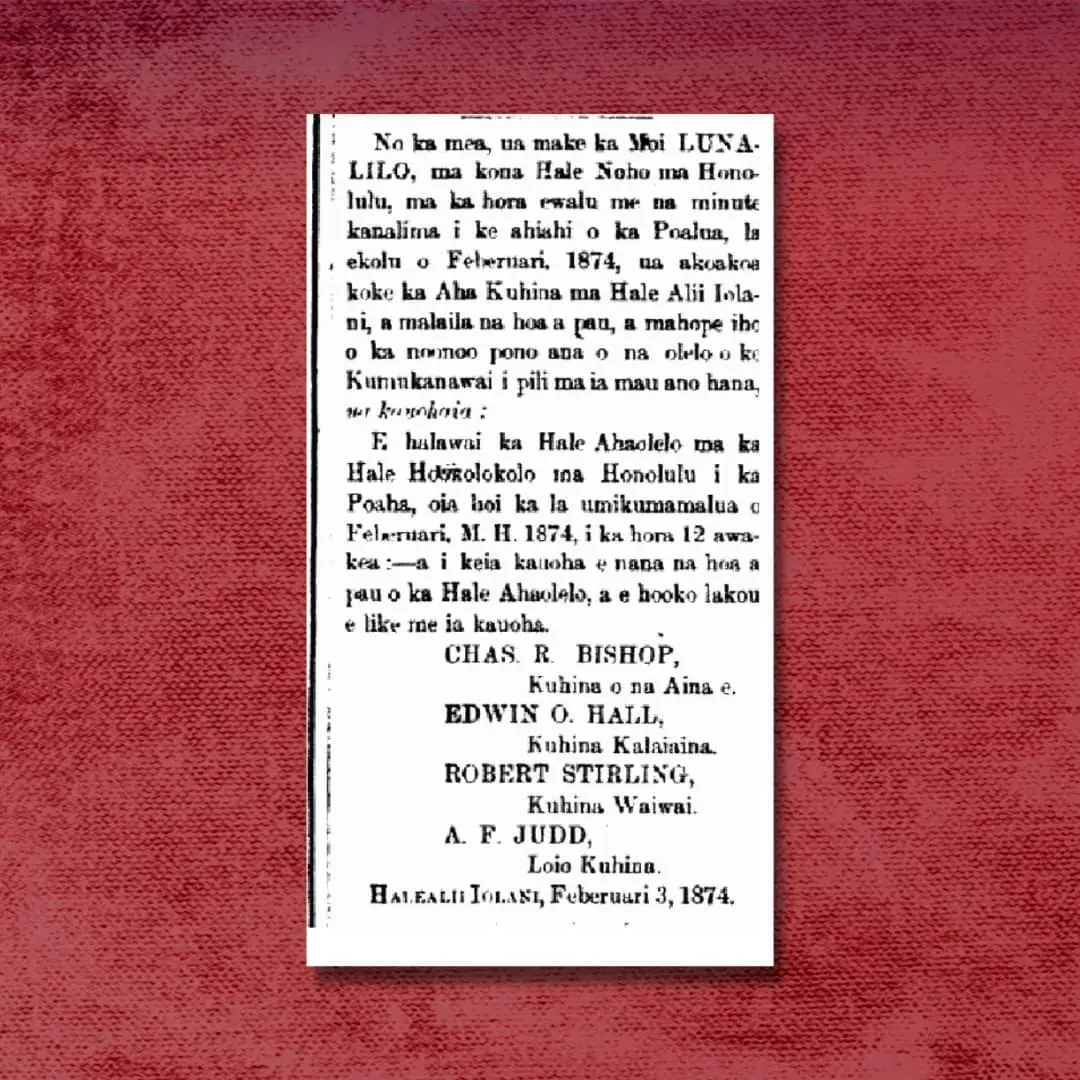 1874년 2월 3일, 루나릴로 Lunalilo 왕은 세자를 두거나 후계자를 지명하지 않고 사망했다.