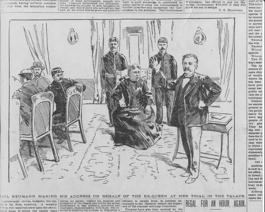 1895년 2월 6일, 릴리우오칼라니 Liliuokalani 여왕의 재판의 둘째 날이었다.