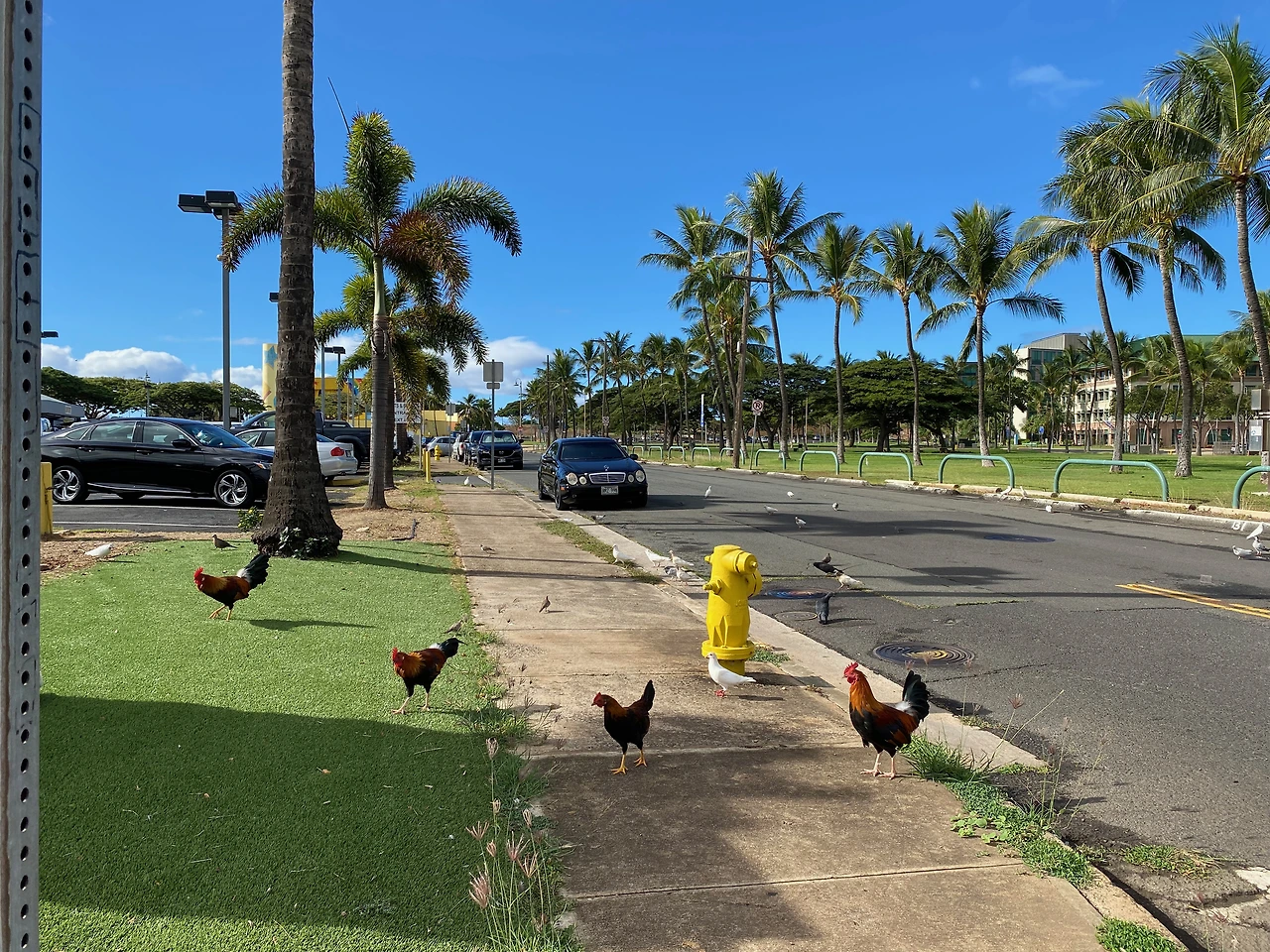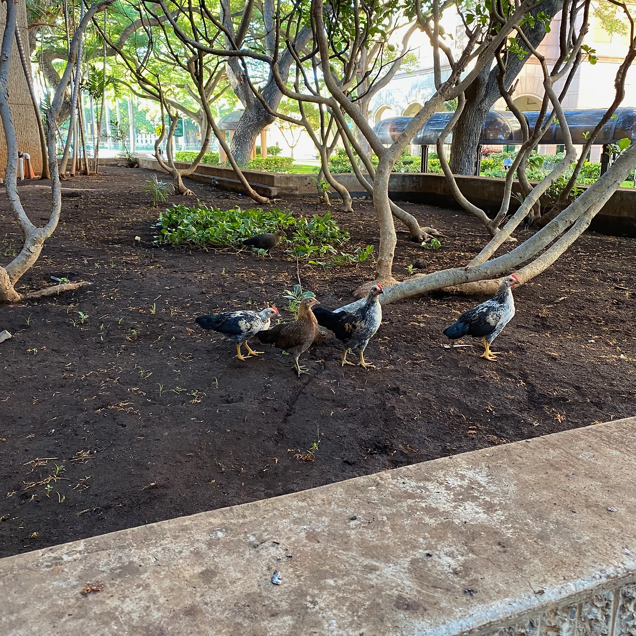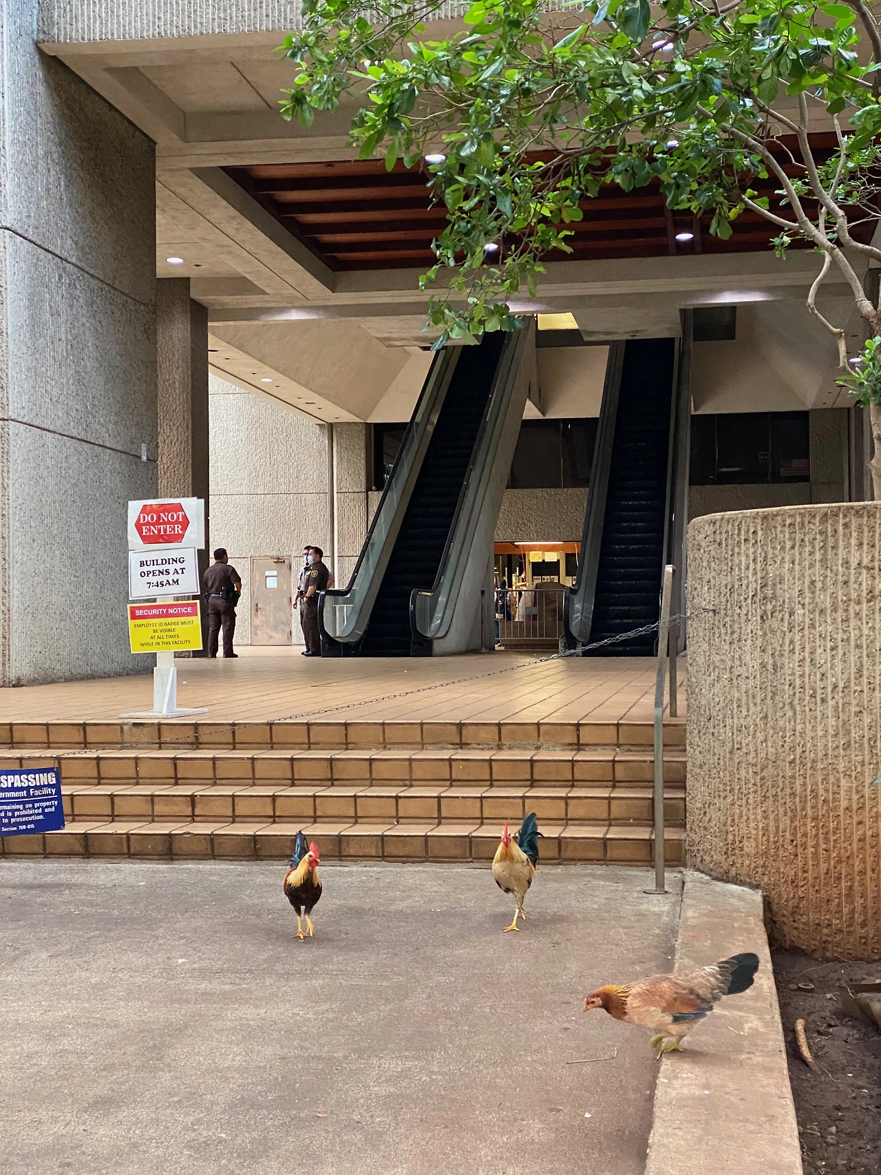 우리 회사 건물 앞, 얘네는 여기가 고향이다. 다운타운이 나와바리인 닭들. 무단횡단도 당당하게 걷기~~