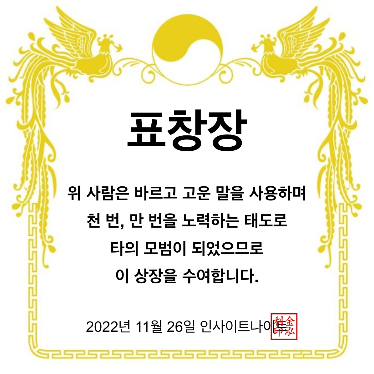 앞으로 여러분께서 하실 수많은 고민과, 겪으실 수많은 어려움을 대표해서, 그리고 그 힘든 모든 일을 잘 해결해나가고 더 큰 사람이 되실 여러분을 위해서, 이 상장을 수여합니다 : )
