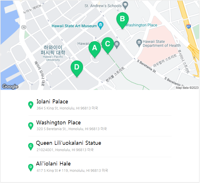 하와이, 아름답게 보존된 자연환경과 넓게 펼쳐진 해변과 석양을 볼 수 있는 지상낙원. 한국에서도 신혼여행이나 1년 살기로 많이 방문하는 휴양지이다. 호놀룰루의 도심에는 하와이의 역사와 문화를 생생하게 느낄 수 있는 역사유적지가 있다. 바로, 이올라니 궁전 (A) 과 워싱턴 플레이스 (B), 하와이의 마지막 군주였던 릴리우오칼라니 Liliuokalani 여왕의 동상 (C), 하와이의 대법원 (D) 등이다. 독립 국가이자 군주와 왕실이 존재했고, 하와이 언어와 구전 문학, 전통 음악과 춤 등 특별한 문화를 보유했던 하와이의 역사를 따라가 보자.