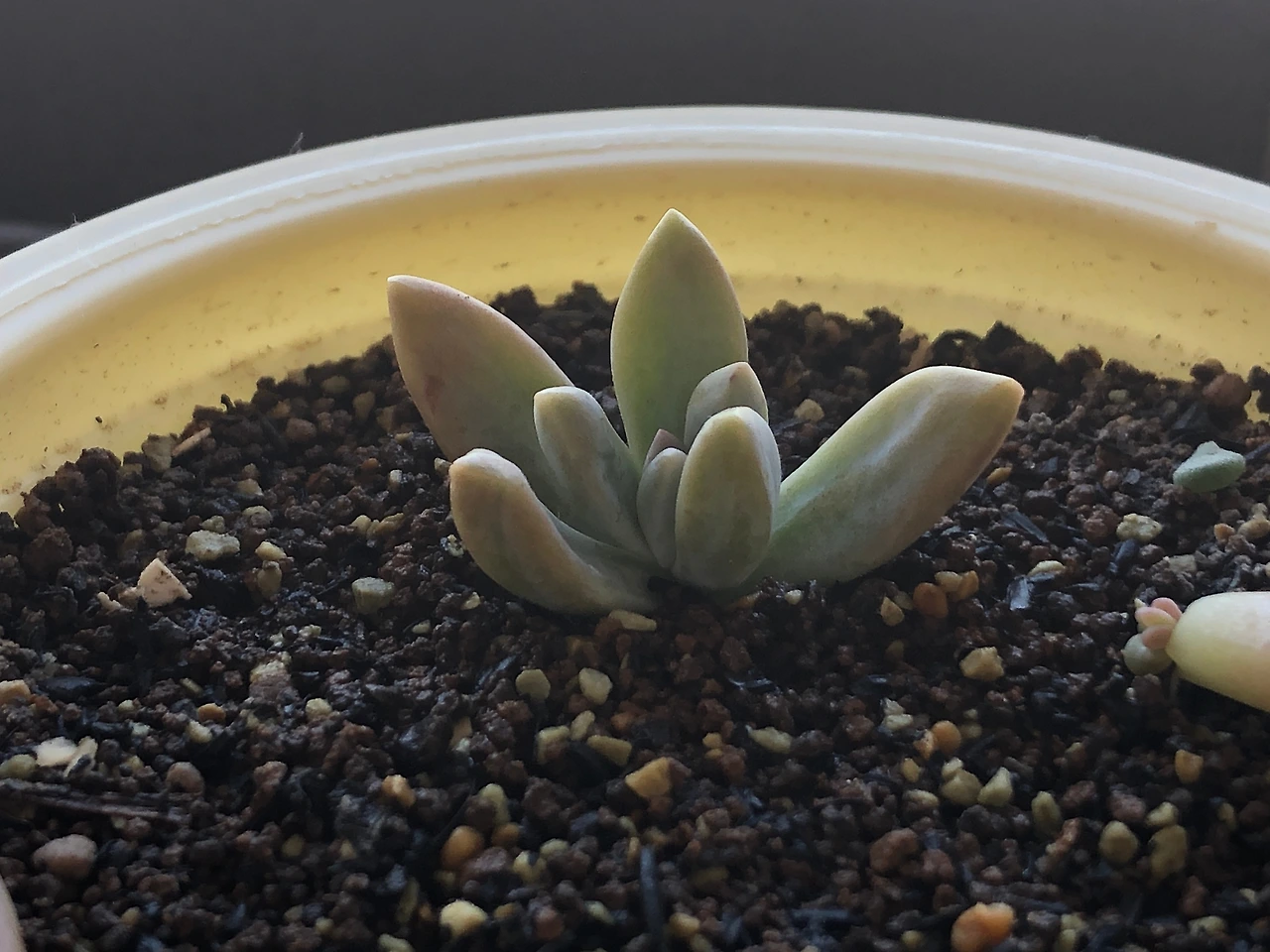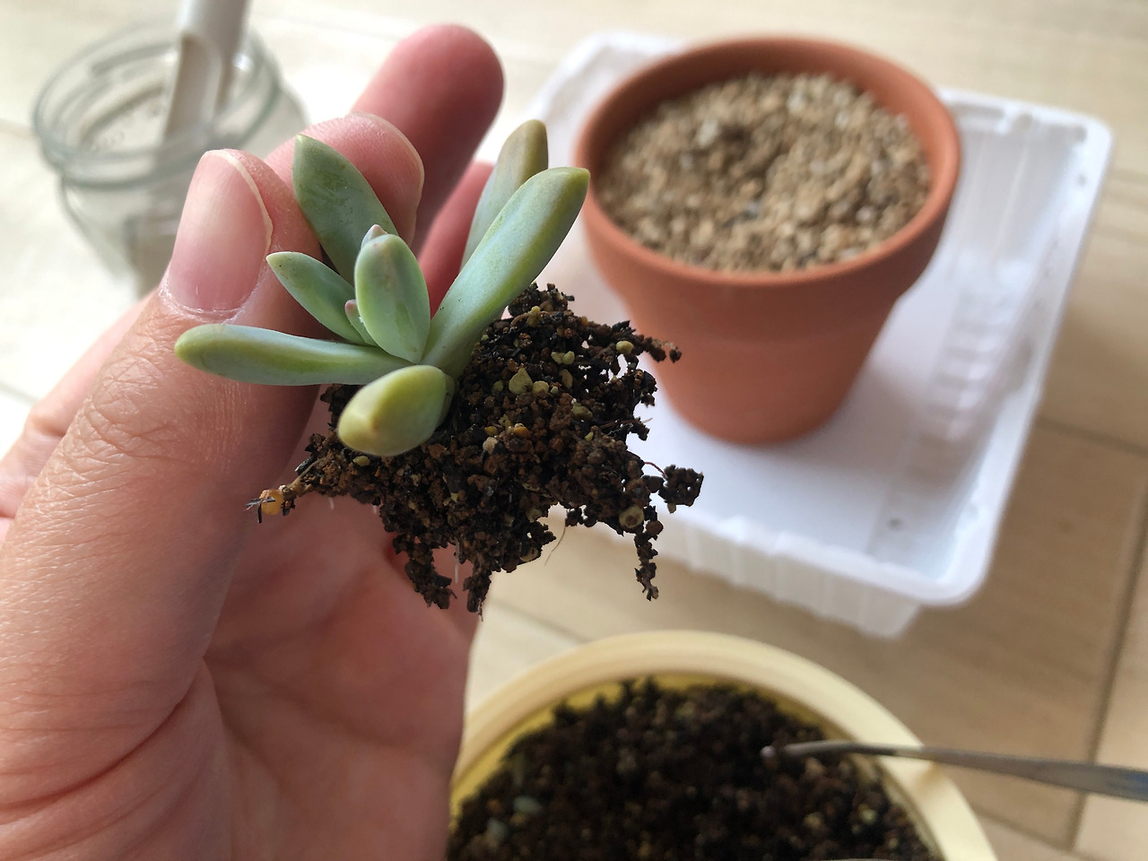 뿌리를 틔우느라 잎 안의 물과 영양분을 소진한 다육이는 이제까지 이상으로 낯빛이 좋지 않았지만,