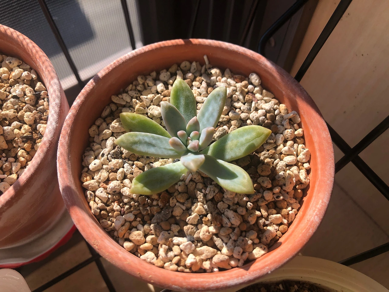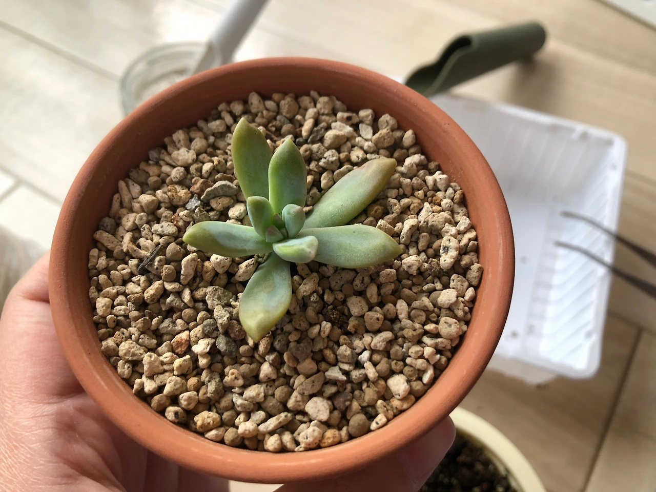핑크베리 잎들이 한창 으쌰으쌰 싹을 틔워내기 시작할 무렵, 남편이 다육 잎을 주워왔다. 언제나처럼 먼저 얘네가 누구인지를 알기 위해 구글 렌즈로 검색해 보았다. 잎만 있었으면 못 찾았을 텐데 다행히 얼굴이 있어 쉽게 찾았다. 일본명 슈레이, 한국에서는 프란체스코 발디. 세덤만 있던 우리 집에 처음으로 온 세덤 이외의 다육이었다. 봄, 가을에 주로 성장하는 춘추형이고, 더위와 추위에 비교적 강하며 잎꽂이와 꺾꽂이가 되는 올라운더. 게다가 길거리 출신이라니 산전수전 다 겪은 베테랑일 것 같았다. 터프해서 어디 두어도 잘 자랄 것 같은 선입견이 생겼다.