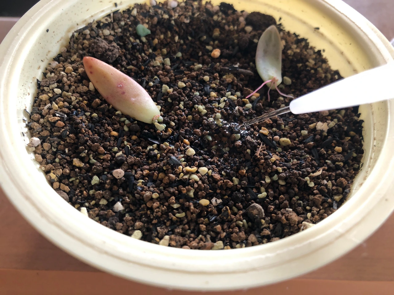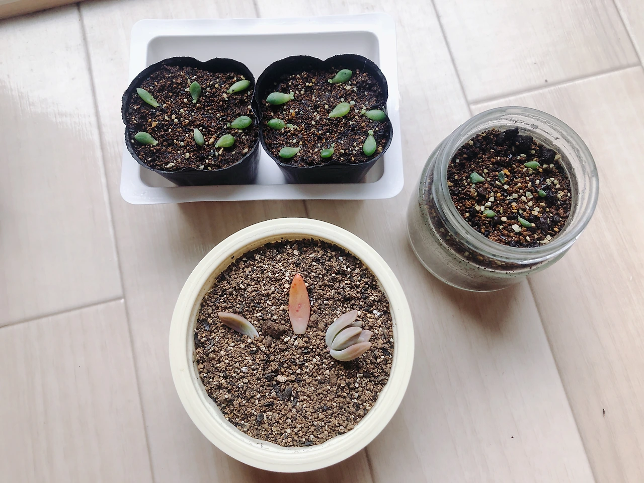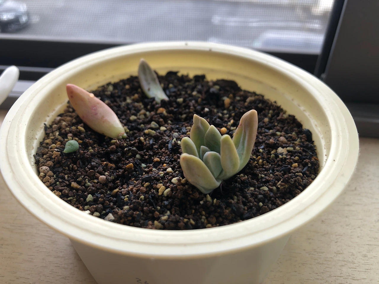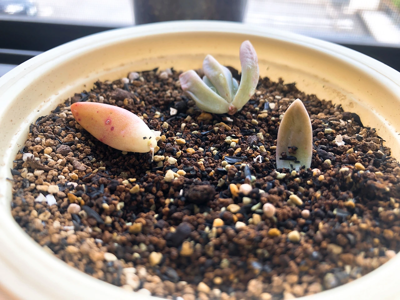 나라면 그런 상상을 먼저 해버리기 때문에, 길거리에 버려진 이름도 모를 다육 잎을 차마 주워올 생각은 하지 않았을 것이다. 하지만 아무것도 모르는 남편이 내 생각해서 가져왔다 생각하면 이 친구들에게 반드시 인생 2막을 선사해주고 싶은 의지가 샘솟았다. 그래서 앞서 잎꽂이를 한 핑크베리나 퍼플헤이즈보다 더 자주 들여다 보고 더 손꼽아 새싹을 기다렸다. 이러면 빨리 나올까 저러면 빨리 나올까, 흙에 꽂았다 꺼냈다 주위에 물을 뿌렸다 별 짓을 다 했다.