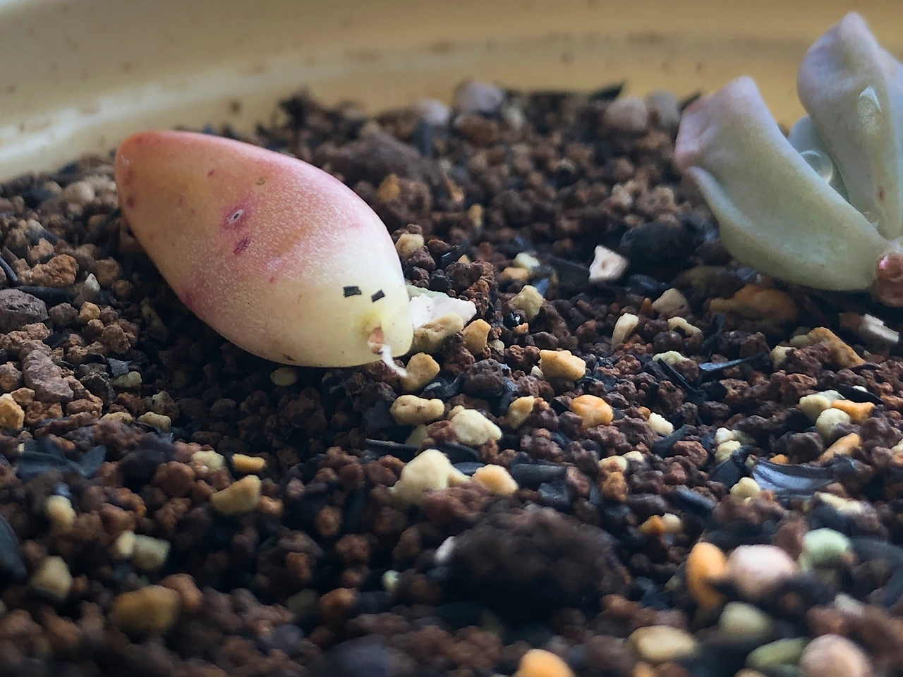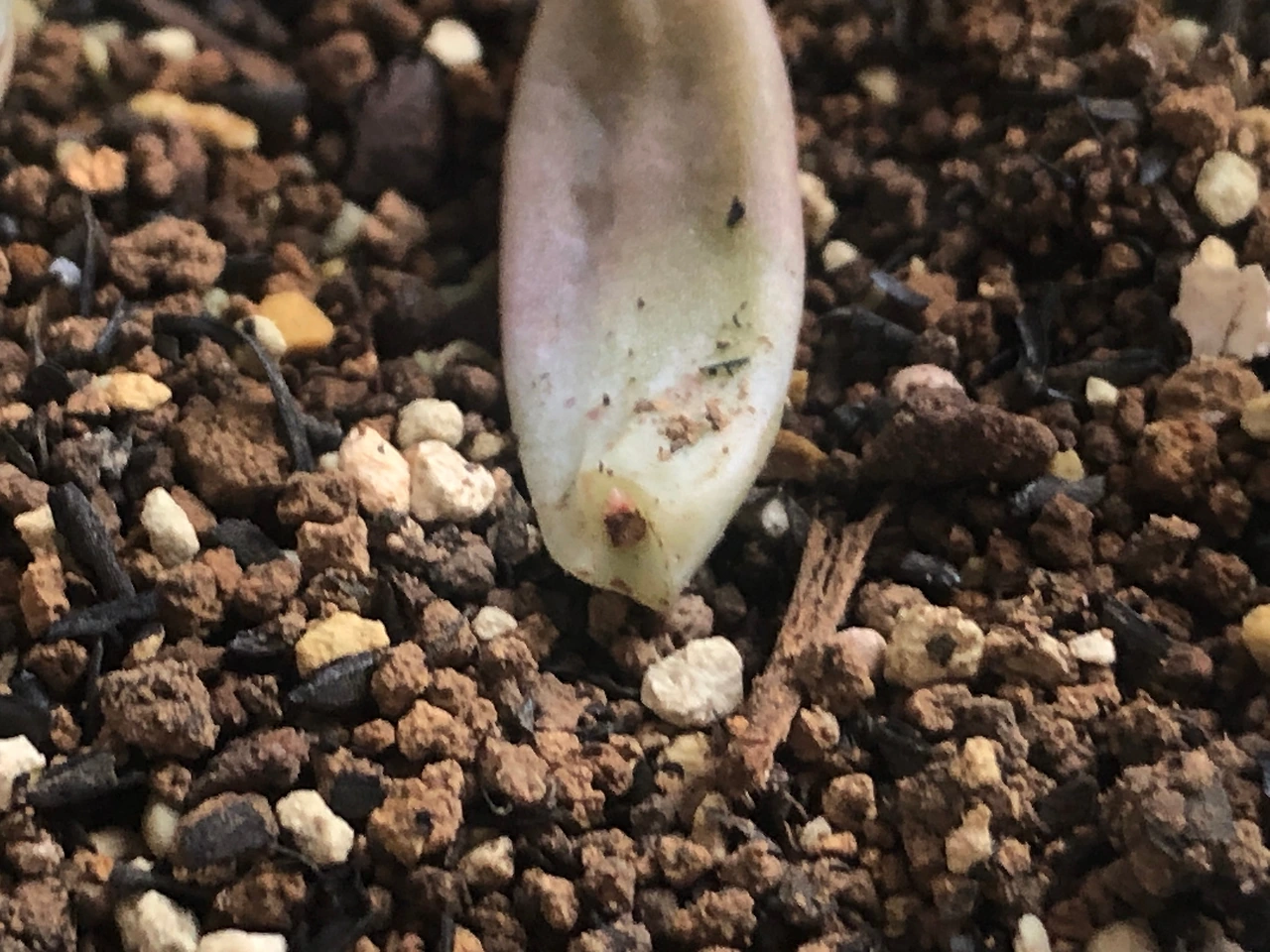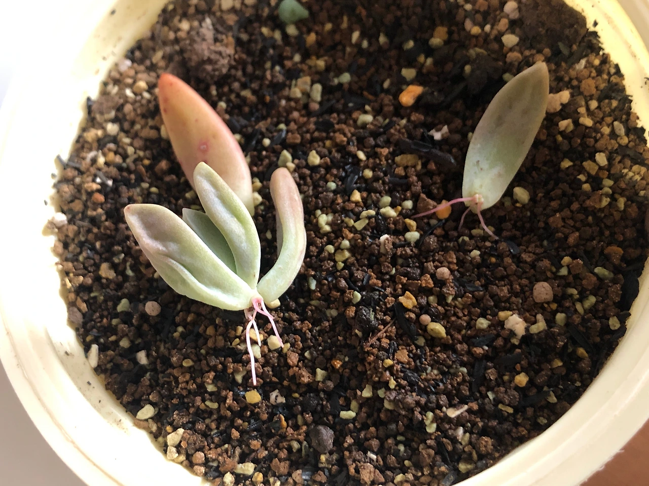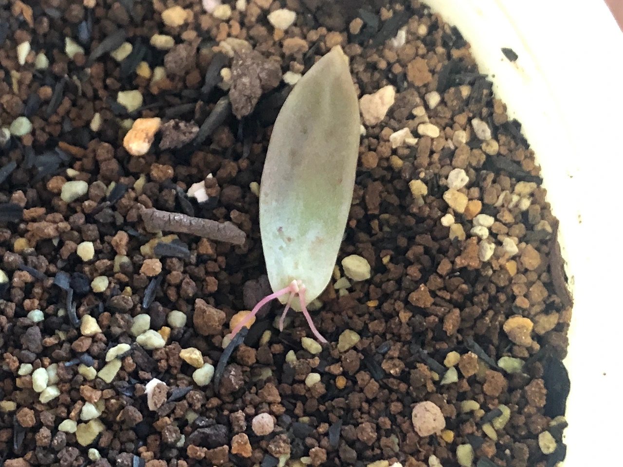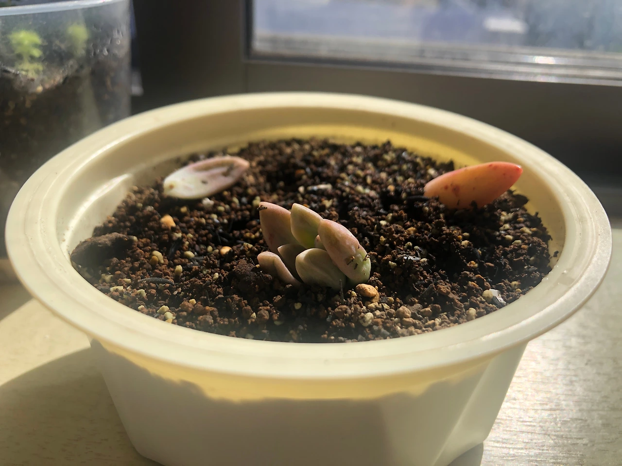나라면 그런 상상을 먼저 해버리기 때문에, 길거리에 버려진 이름도 모를 다육 잎을 차마 주워올 생각은 하지 않았을 것이다. 하지만 아무것도 모르는 남편이 내 생각해서 가져왔다 생각하면 이 친구들에게 반드시 인생 2막을 선사해주고 싶은 의지가 샘솟았다. 그래서 앞서 잎꽂이를 한 핑크베리나 퍼플헤이즈보다 더 자주 들여다 보고 더 손꼽아 새싹을 기다렸다. 이러면 빨리 나올까 저러면 빨리 나올까, 흙에 꽂았다 꺼냈다 주위에 물을 뿌렸다 별 짓을 다 했다.