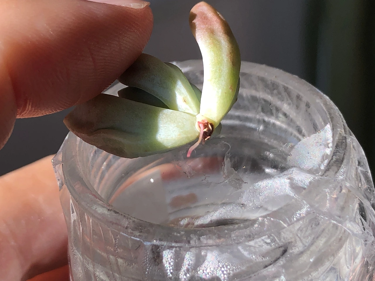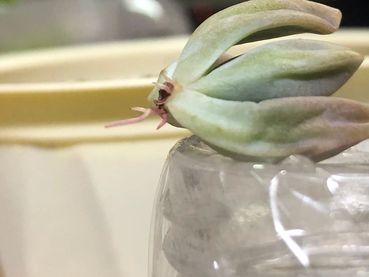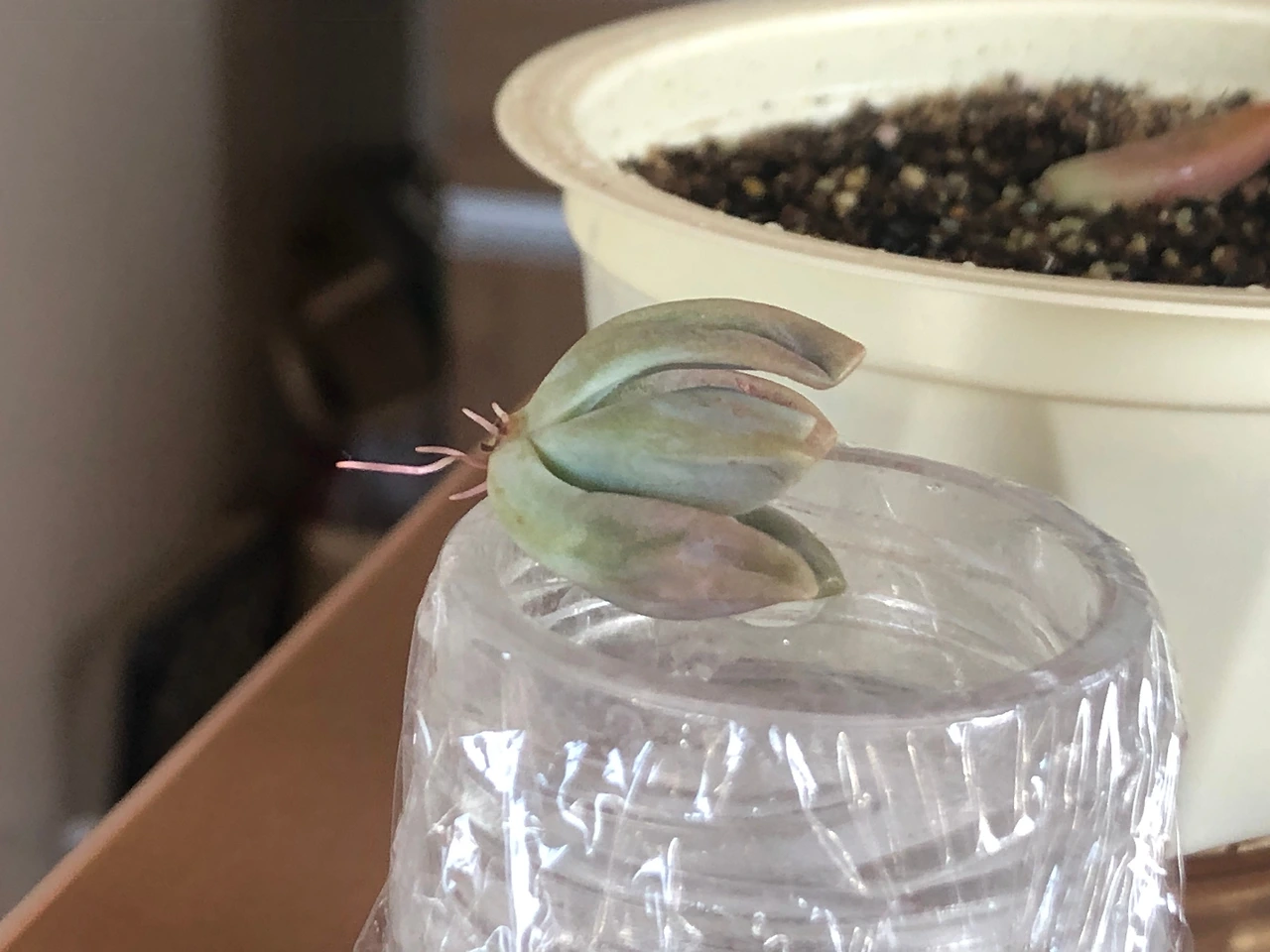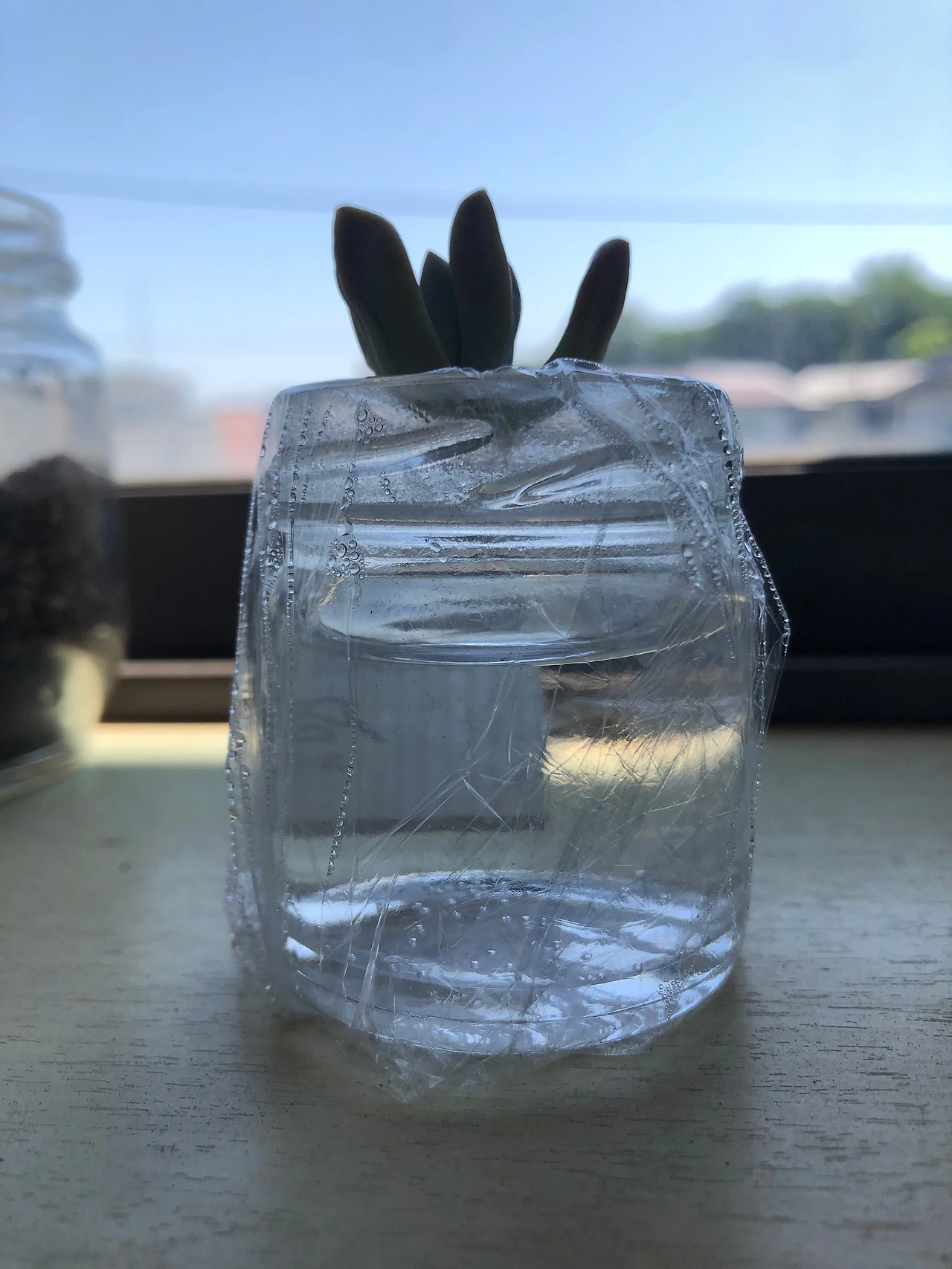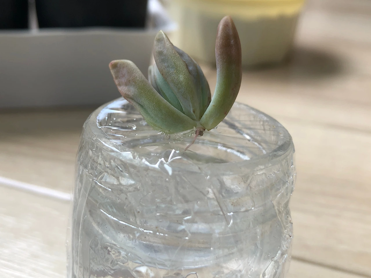 작은 유리병에 뿌리에 닿지 않을 만큼 물을 담고 랩을 씌운 뒤 작은 구멍을 뚫고 그 위에 다육이를 얹어놓았다. 다육이 밑동만 물을 향하게 해 놓으면 뿌리가 빨리 나온다는 이야기를 들어서.
