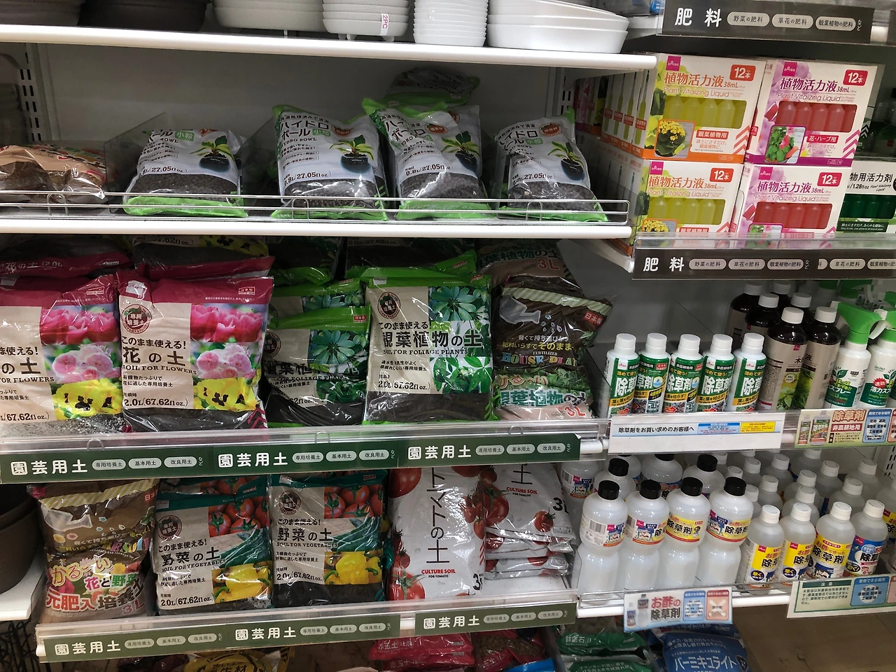 나는 지금 일본 다이소의 원예코너 앞에 와 있다. 어느 점포를 가도 제일 안쪽 구석에 자리 잡고 있어 딱히 눈에 띄지도 않고 사람들이 많이 가지도 않는 바로 그 코너. 딱 한번, 아주 예전에 하이드로 볼을 사러 왔을 뿐 그 이후론 스칠 일조차 없었는데 마음먹고 둘러보니 생각보다 상품구성이 아주 충실하다. 화분, 영양제, 물뿌리개 같은 낯익은 것들부터 화분선반, 차양막, 원예가위, 원예용 로프, 지지대, 호미, 낫, 샤워 노즐처럼 야외 가드닝에 필요해지는 것들까지 꽉꽉 들어차 있다. 흙도 관엽식물용, 야채용, 화훼용 등 용도에 맞춘 배합토들이 종류별로 구비되어 있어 홈센터 원예코너 못지않았는데, 재미있는 것은 흙 바로 옆에는 제초제가 놓여 있던 점이었다.