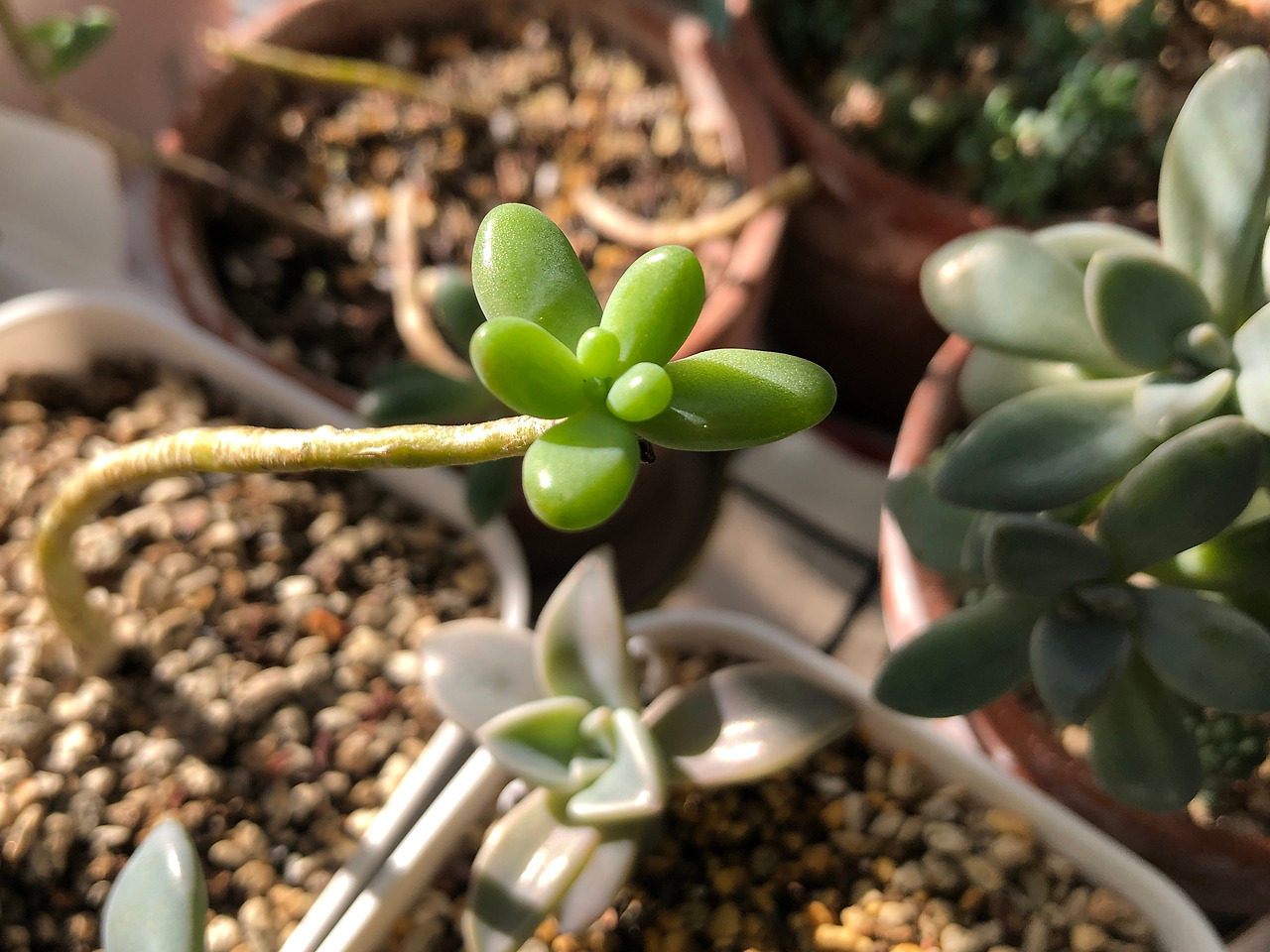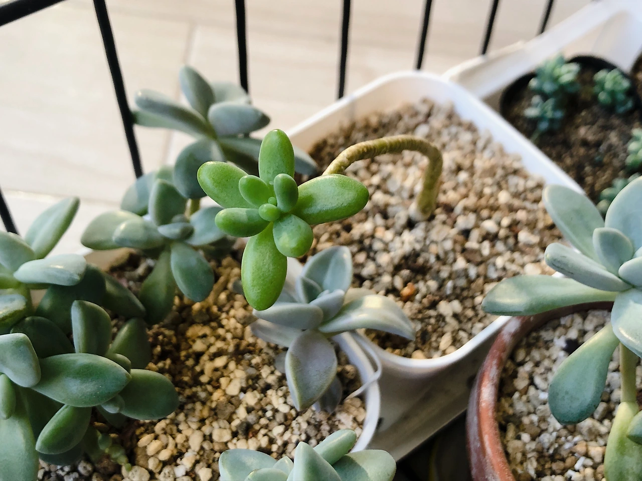 우리 집 다육식물들. 누구 하나 마음가지 않는 친구가 없지만 그중 가장 큰 관심을 가져가고 있는 건 이 녀석이다. 길고 구부정한 줄기에 얼굴만 달랑 달려있는 녀석. 여러 개체와 모아심기 된 것을 데려와 '청솔이 아닐까?' 하는 추측만 있을 뿐 정확한 이름도 알지 못한다. 확실한 것은 그가 우리 집에서 가장 오래된 다육식물이라는 것뿐이다.