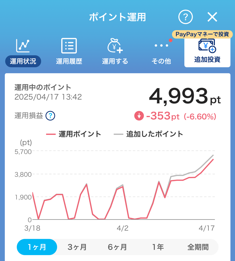 작년 11월부터 심심풀이로 하고 있는 포인트 운용, 모의 주식 비슷한 것이다. 실제로 돈을 쓰는 건 무서우니 공짜로 받은 포인트만 가지고 심심풀이로 하고 있는데, 1포인트가 1엔이니 이 사진으로 설명하면 나는 지금 353엔의 손해를 보고 있다.