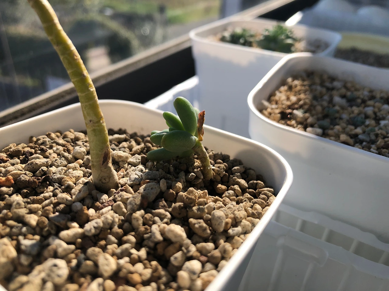 그렇게 단호한 가위질 덕분에 이 머리는 살아남을 수 있었다. 남은 줄기는 마지막 힘을 짜내어 작은 싹을 틔워보기도 했지만, 결국은 밑동이 완전히 썩어 죽어버렸다. 힘없이 흙에서 뽑혀 나오는 줄기를 버리는 마음은 여전히 씁쓸하지만, 남은 머리가 성실히 자라나는 모습을 보면 약간의 위안이 된다. 이렇게 다육이는 대에서 대를 이으며, 영원히 살아나가는 거라고 스스로를 토닥이며, 나는 오늘도 다육이를 향해 이렇게 주문을 외운다.
