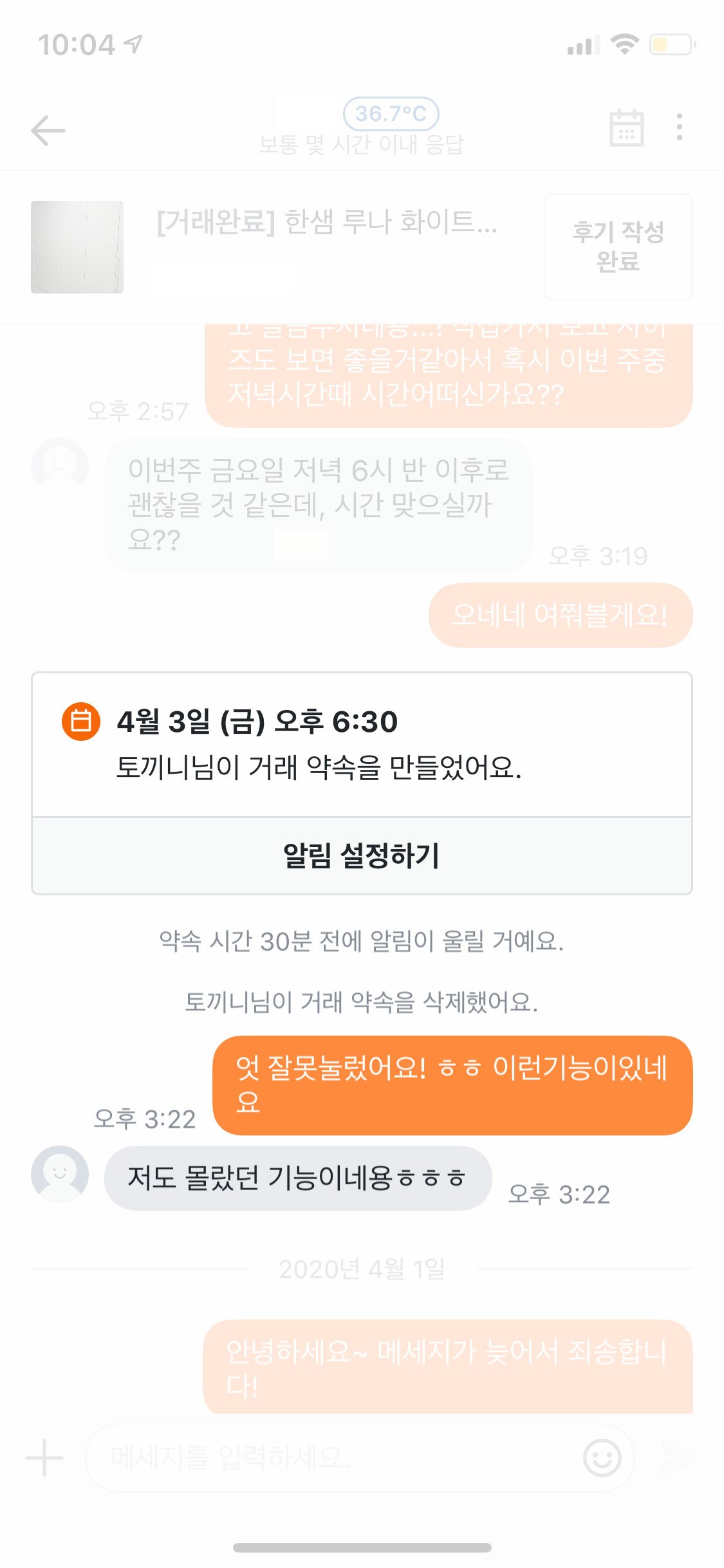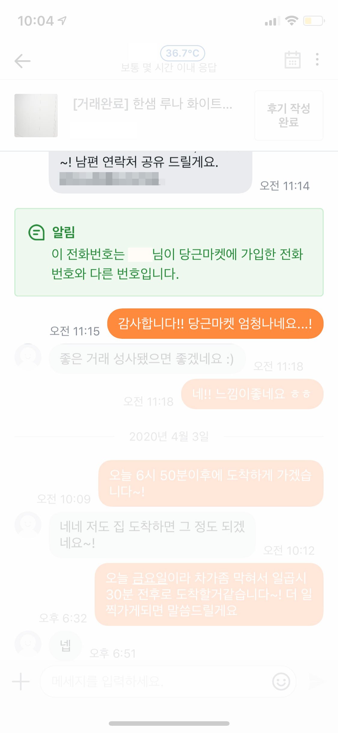 이 기능은 이번에 열심히 사용하면서 알게 된 기능이다. 나는 중고거래를 하면서 물건을 판매하는 사람과 조금 길게 이것저것 물어보는 편이다. 그래서 그 사람의 캐릭터도 어느 정도 알게 되고 그에 따라 자연스럽게 그 물건을 어떻게 사용했을지 파악하게 된다. 대화 속에서 시간이 나오거나 개인정보가 나오게 되면 당근 마켓에서 친절하게 설명 & 설정하는 기능이 있다. 그리고 내가 가입한 정보와 다른 번호를 알려준다면 혹시 모를 사기를 대비해서 상대방에게 알림을 준다. 대화를 다시 보니 나에게만 알려주었던 것 같다.