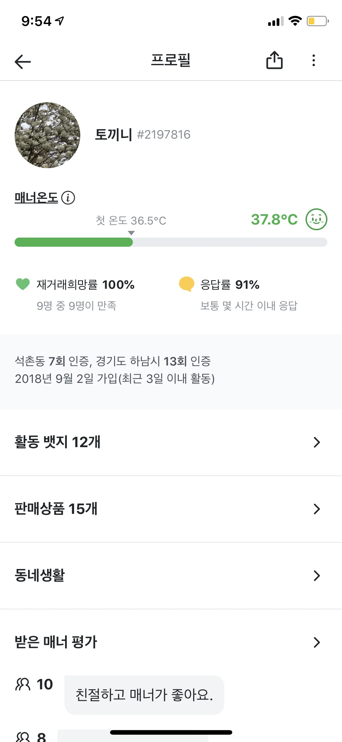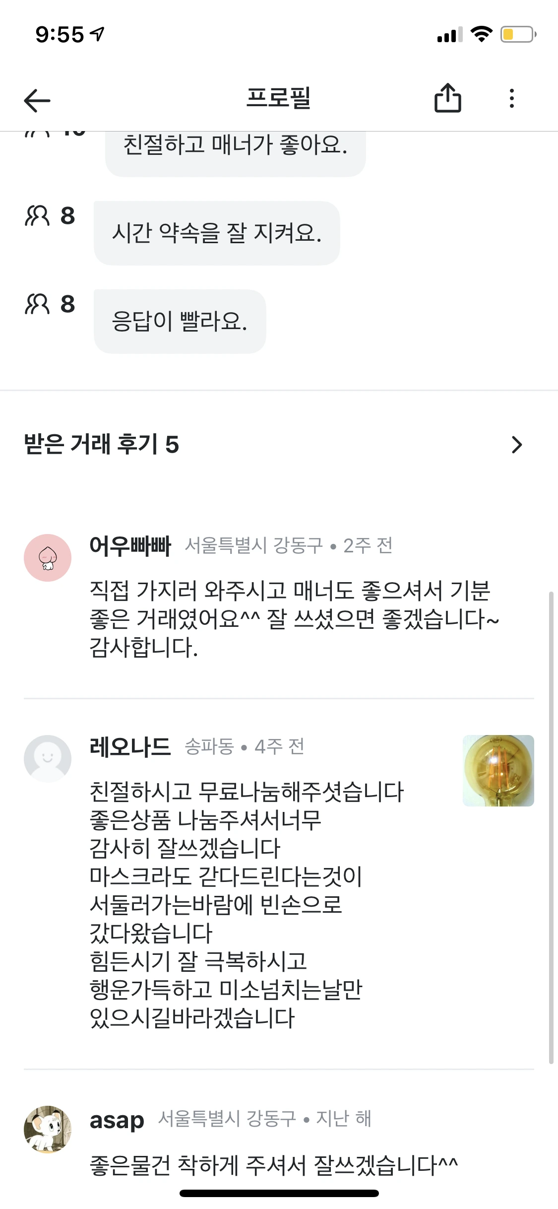 그것은 바로 올린 사람의 프로필을 보는 것이다. 이 사람이 올린 매물이 몇 개가 있는지, 다른 사람들이 남긴 후기들은 좋은지, 한 사람이 냉장고를 세 개 네 개씩 올려놓는다면 약간 의심을 해볼 수 도 있을 것이다. 나는 중고업자에게 사고 싶은 것이 아니라 동네 사람들이 쓰다가 버릴 수 없는 물건들을 사는 것이기 때문이다. 그리고 보통 내가 원하는 상품을 가진 사람은 비슷한 물건들을 소유하고 있다. 그것들을 묶어서 산다면 조금 에누리도 가능한 건 덤... 파는 입장에선 두 번 안 나가도 되니까!