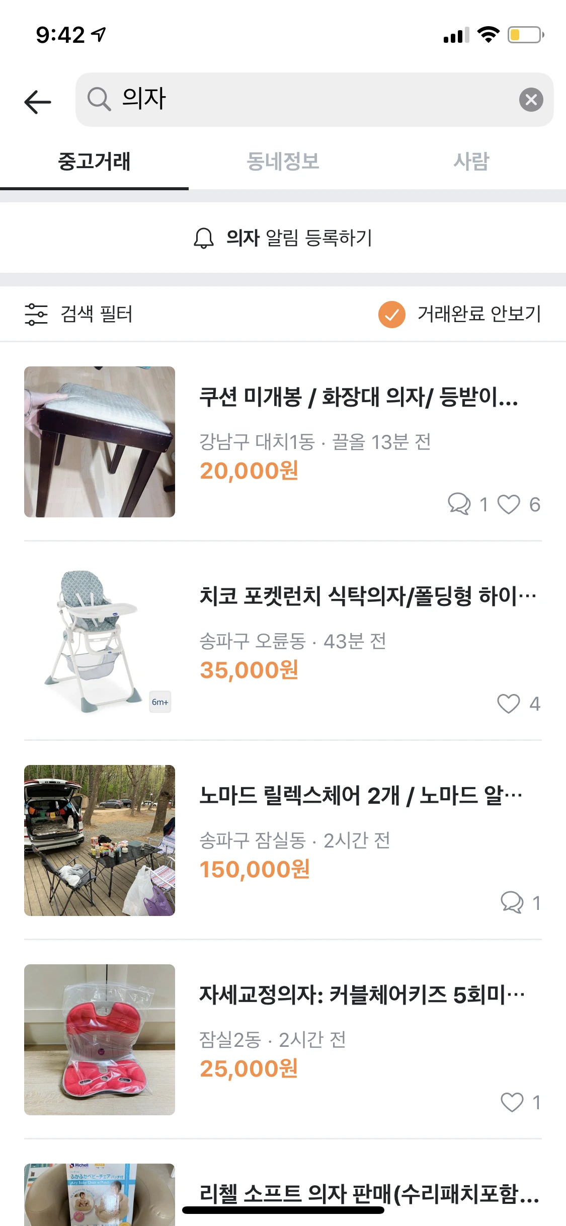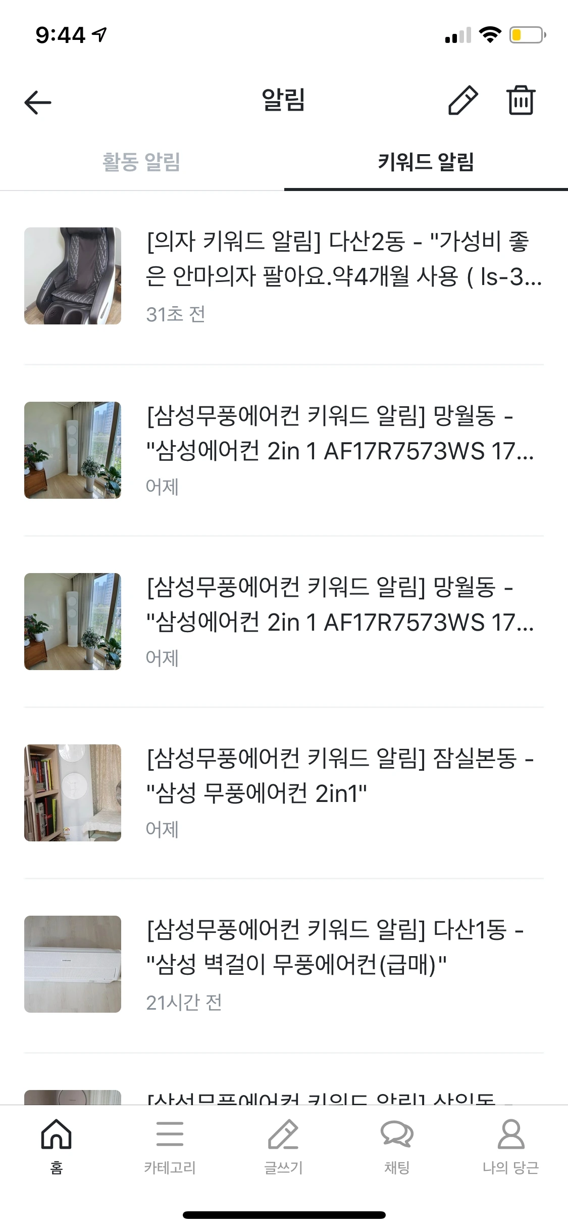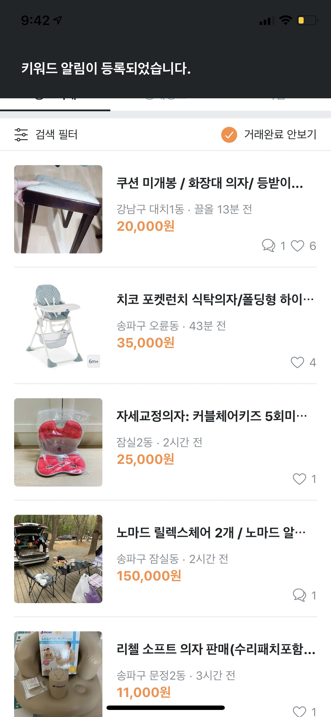 좋은 매물은 올라와있는 법이 없다. 그래서 앞으로 올라오는 글에서 찾아야 하는데, 당근마켓은 알림 등록과정이 너무나 직관적이고 쉽다. 중고거래를 하기로 결심한 유저로써 가장 먼저 필요한 것을 통합 검색어에 입력할 것이다. 그러면 제일 상단에 의자 알림 등록하기라는 버튼이 뜬다. 그것을 누르면 키워드 알림이 등록되는데, 그때부터 당신은 1주일간은 의자라는 키워드가 등록될 때마다 당근마켓에 들어가게 된다. 좋은 매물이 올라왔을 때에는 바로 대화를 걸어 예약을 해놓거나, 애매하면 하트를 눌러놓는다.
