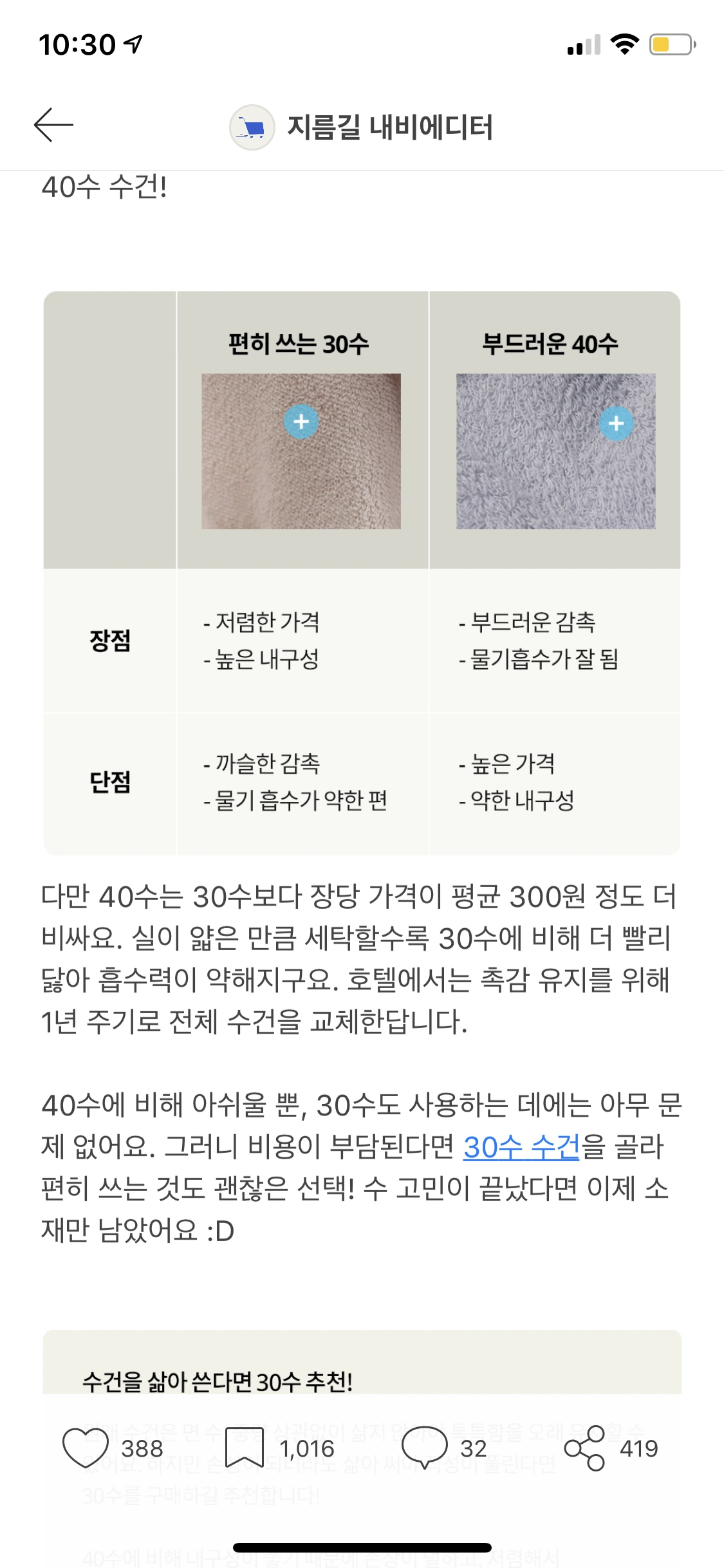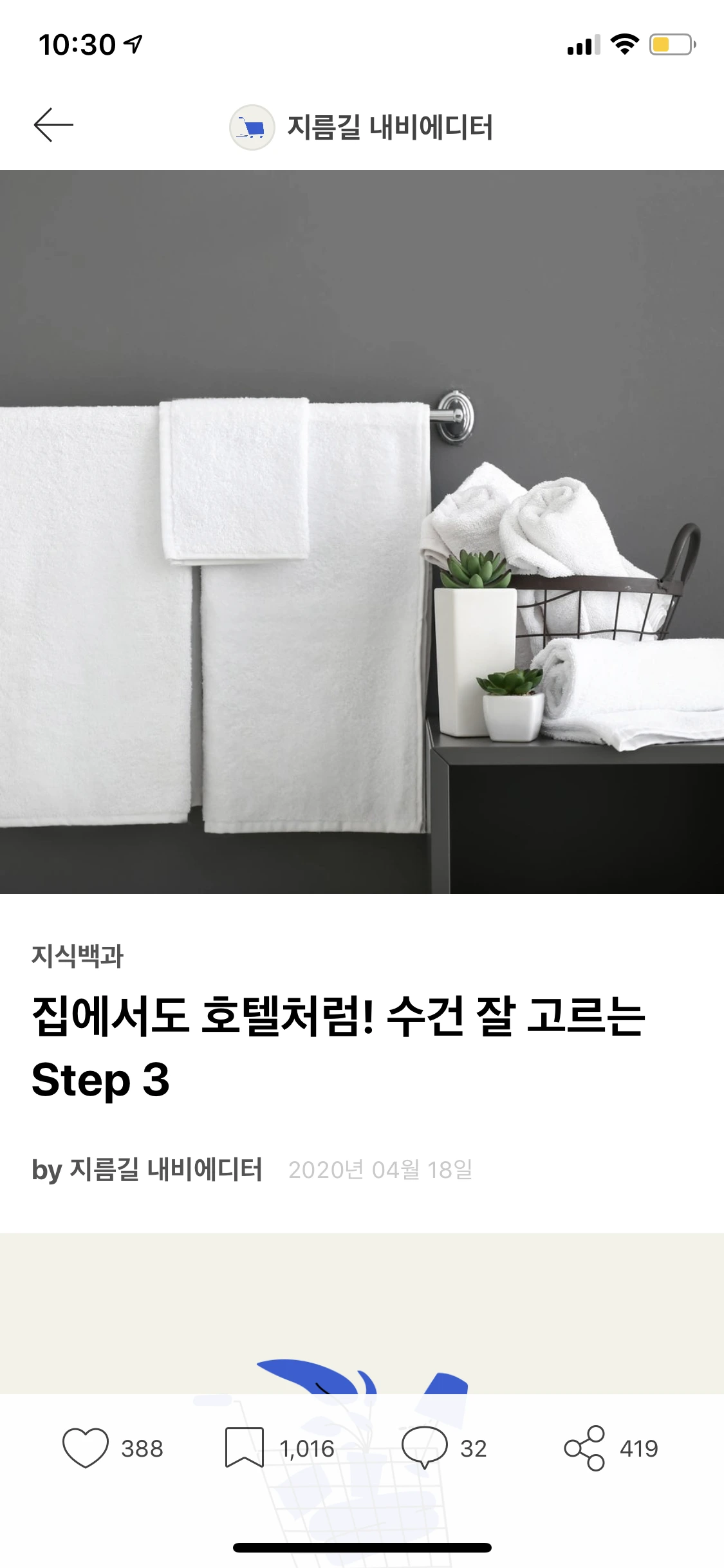 이사를 막상 하니, 자잘하게 사고 싶은 것 사야 하는 것들이 많다. 근데 막상 사려하니 모아서 설명해주는 곳이 있었으면 좋겠다. 찾다 보니 수건에 대한 거의 논문 수준의 글이 있었다. 30수, 40수 몇 그람... 알아보고 싶지는 않지만 누가 알려줬으면 좋겠는 이런 정보들을 잘 모아서 설명해준다. 글을 다 읽고 나면 내가 사고 싶었던 수건은 40수에 뱀부얀소재 170g-180g의 수건이었다는 걸 알게 된다. 그리고 자연스럽게 + 태그와 함께 바로 그 수건을 구매를 할 수 있게끔 유도한다. 이 여정이 너무 편해서라도 다른 곳 안 찾아보고 바로 구매를 하게 된다.