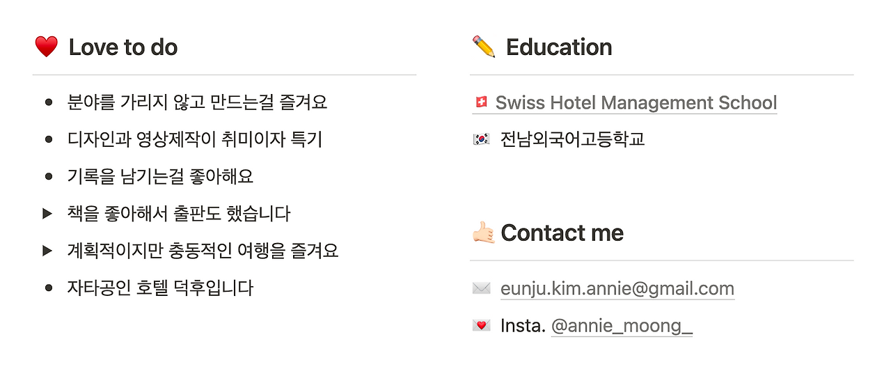 나는 먼저 무엇을 좋아하는지를 보여주었다. 취향이 계속 변해가는 만큼 계속해서 변경될 여지가 많은 공간이기도 하다. 옆에는 별 볼 일 없는 나의 학력을 적었다. 보통 해외에서 대학을 재학 중인 한국인이라면 해외에서 중학교나 고등학교를 나온 경우가 많다. 아무래도 모든 학창 시절을 한국에서 보낸 사람이 갑자기 해외로 나가기가 쉬운 선택은 아니기 때문일 것이다. 이런 어려운 선택을 단호하게 해내었던 나를 보여주고 싶어 굳이 학력을 기재하였다. 전남 촌구석에서 어쩌다 스위스를 갔지?라고 궁금증을 가져준다면 뿌듯할 것 같다. 그리고 연락처를 덧붙였다. 연락처는 어떻게 나타내야 가장 효율적 일지 매번 고민한다. 우선은 담백하게 가져가기로 했다. (여러분 인스타 친구 해주세요